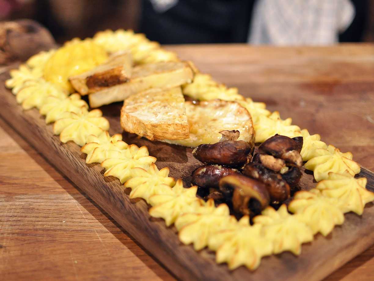 Ugnsbakad rotselleri med pommes duchesse, vitlöksfrästa champinjoner och brynt hollandaise