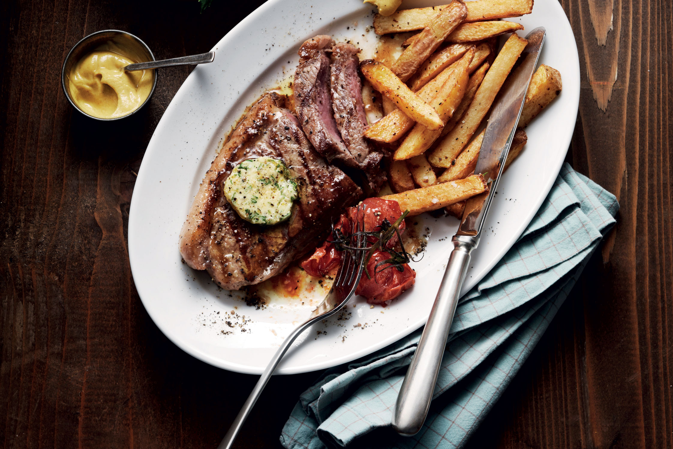 Grillad entrecôte med rucolasmör och hemgjorda pommes frites