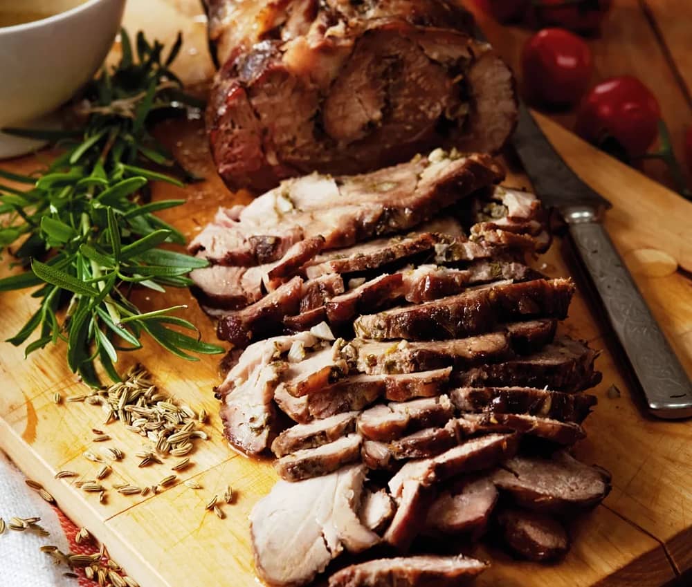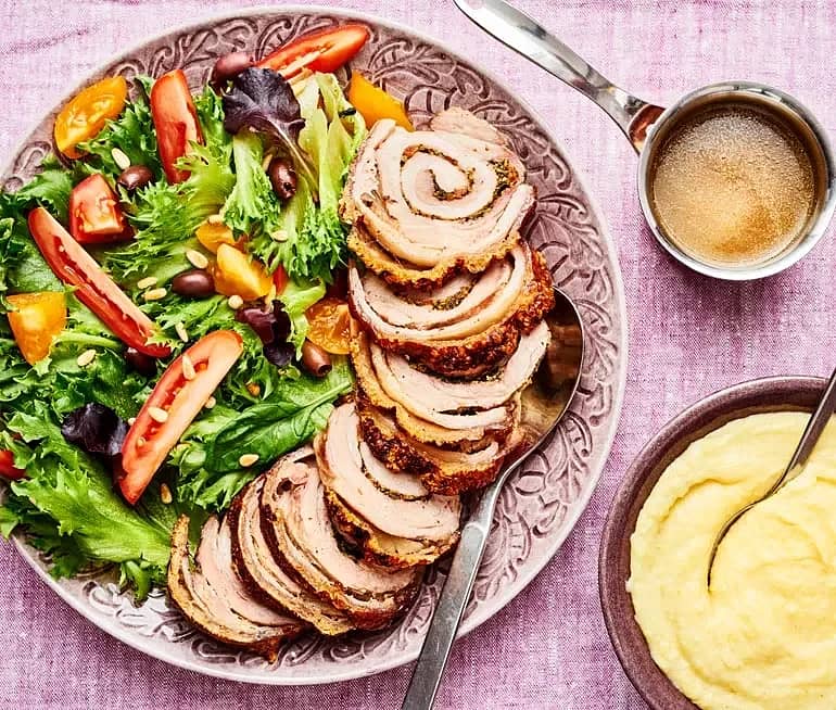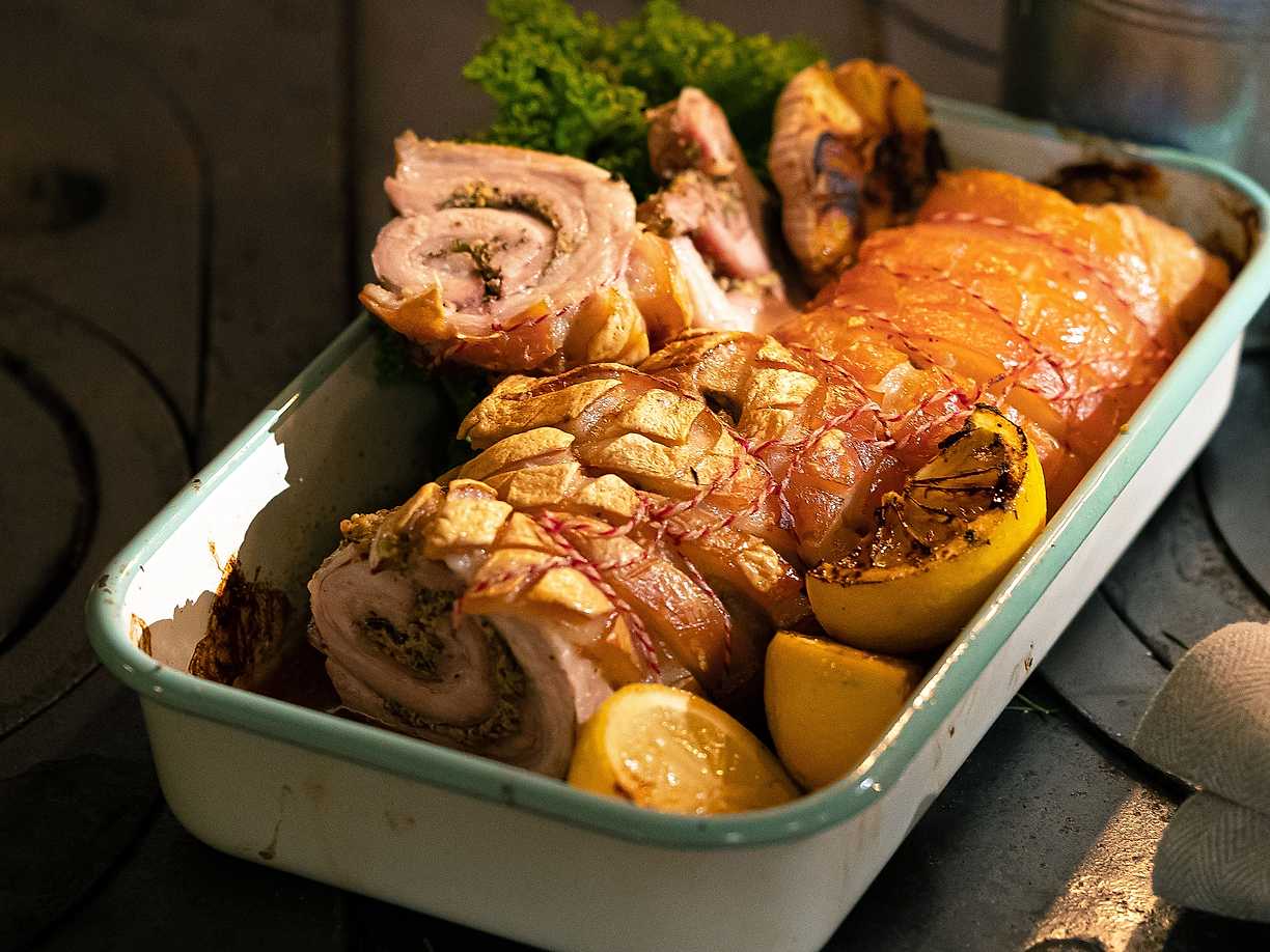 Porchetta med rostade grönsaker och spenat- och citroncrème