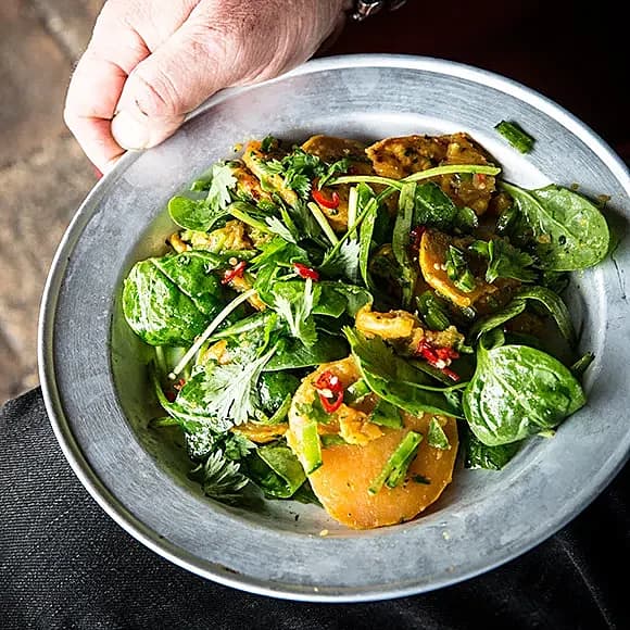 Rostad potatis med krispig chorizo och krämig zucchinisallad