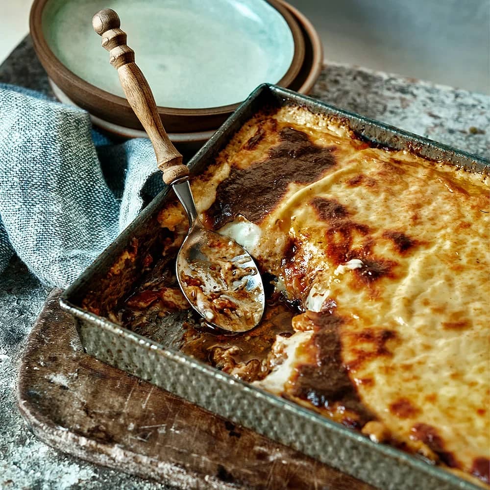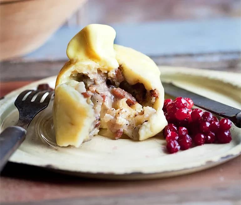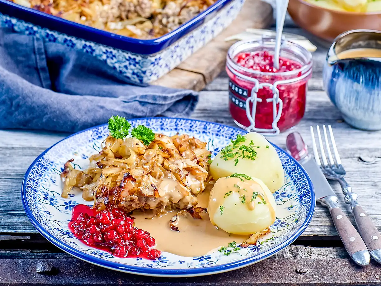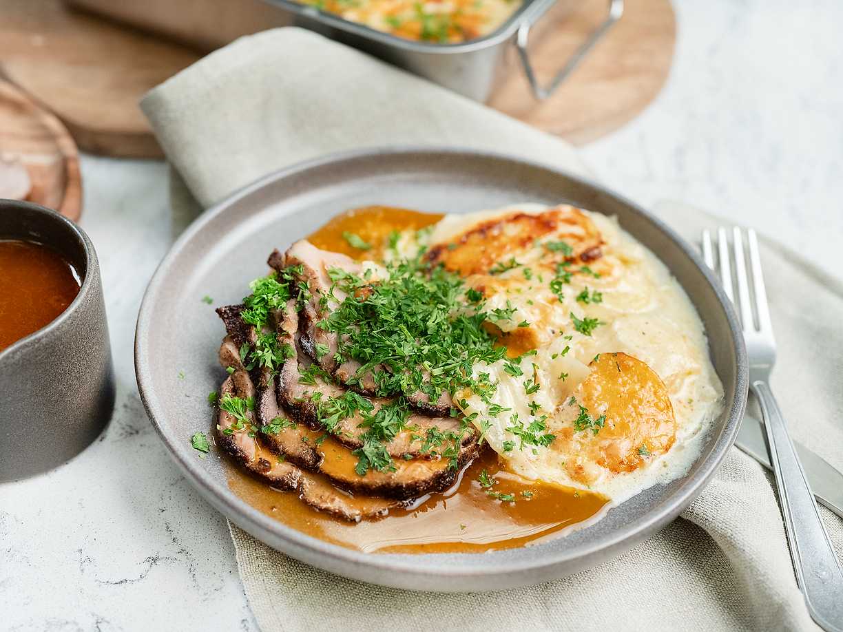Fläskkarré med potatis- och rotsellerigratäng och äppelsky