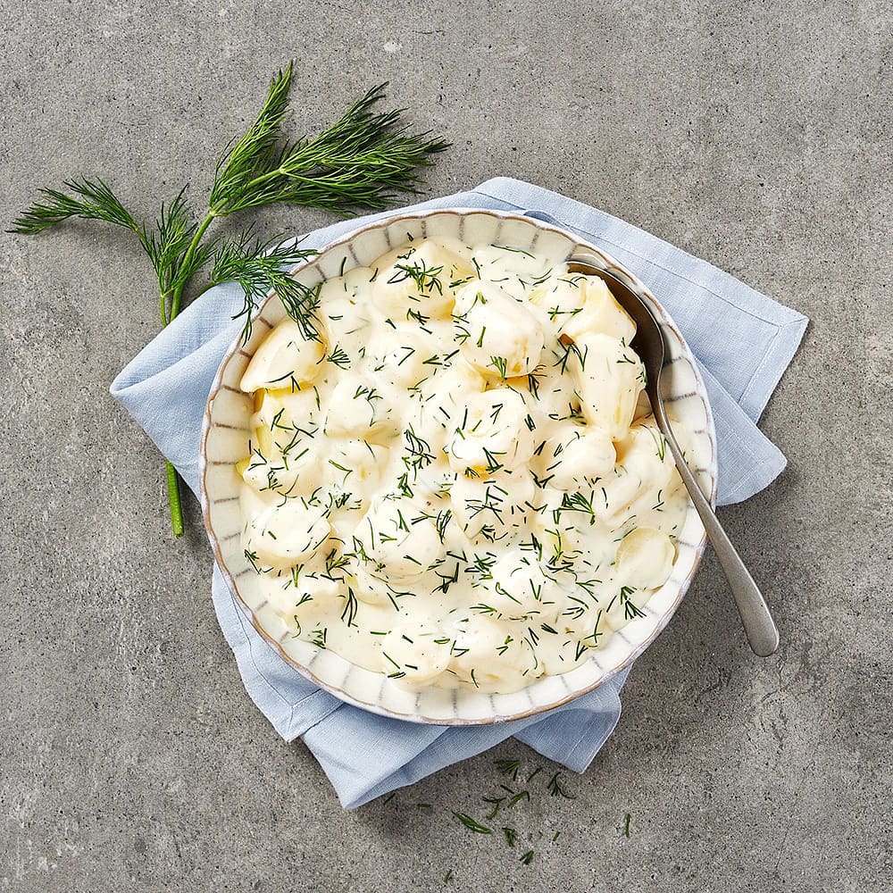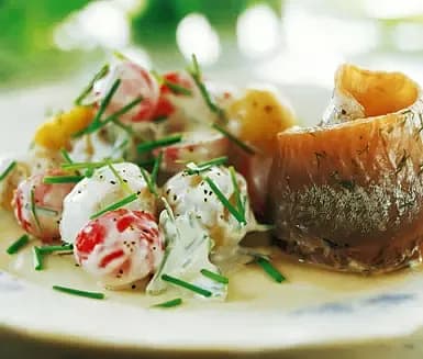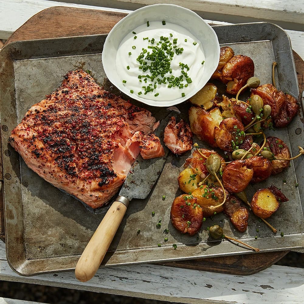 Stekt lax med dill- och pepparrotsslungad potatis och romsås