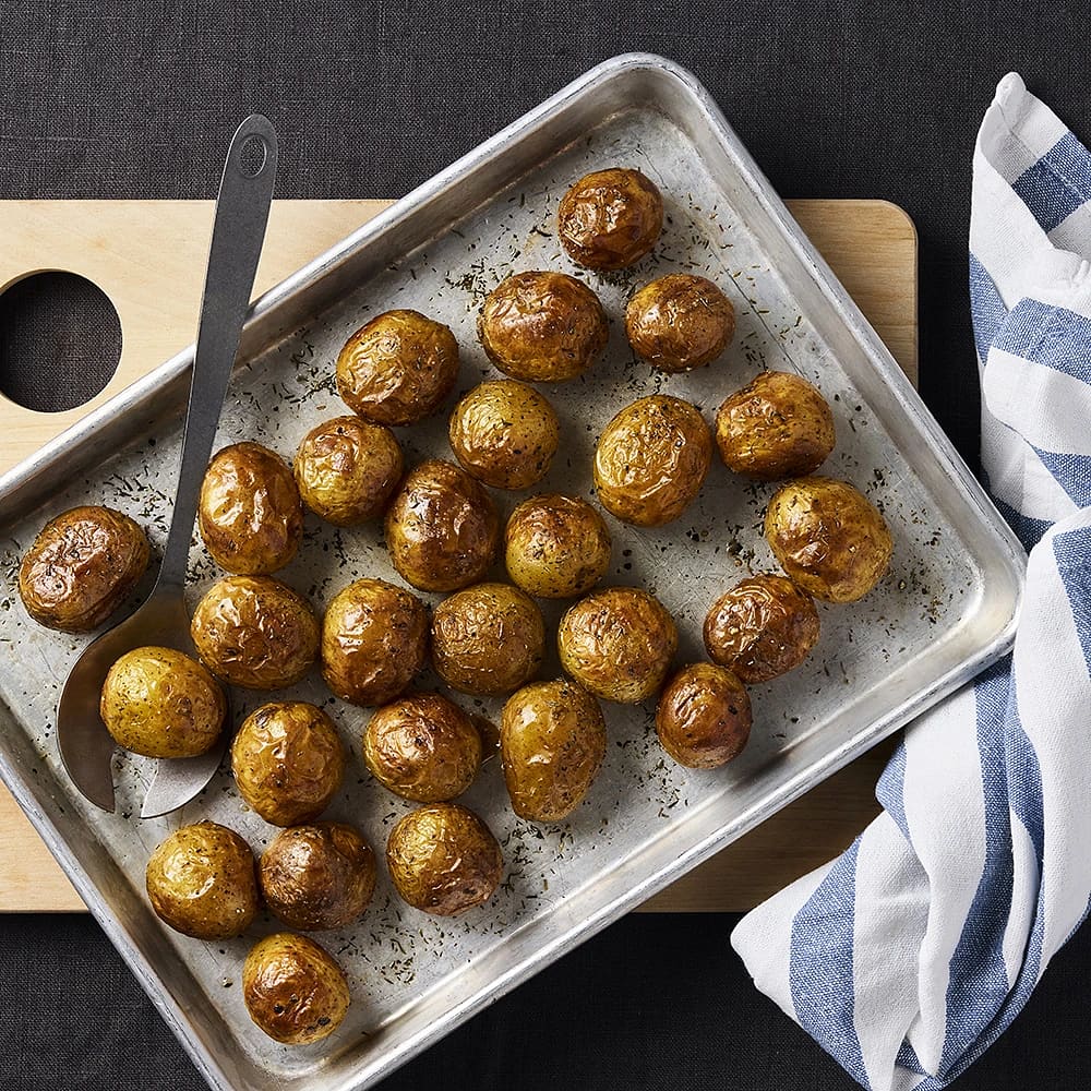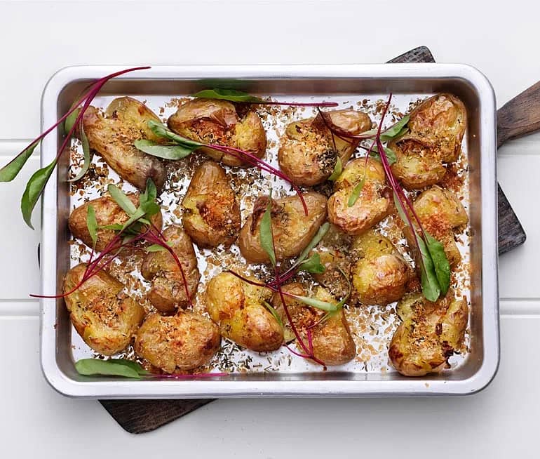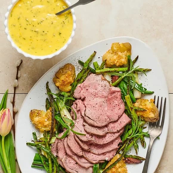Örtstekt lammstek med krossad rostad potatis och rosmarinaioli