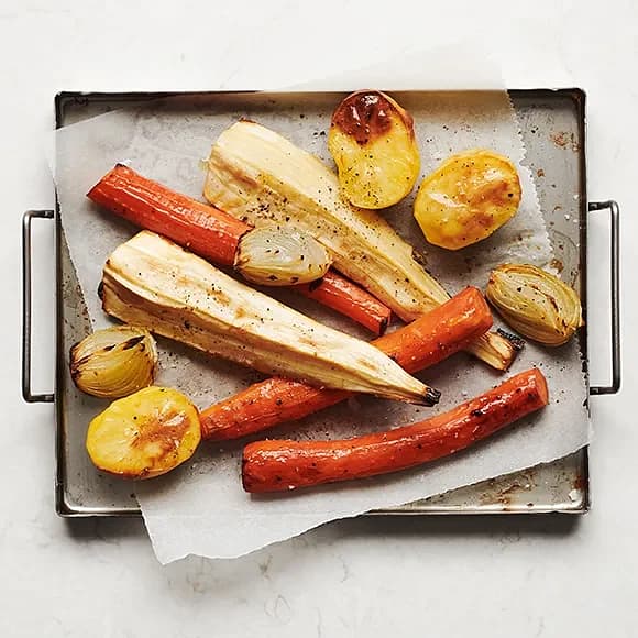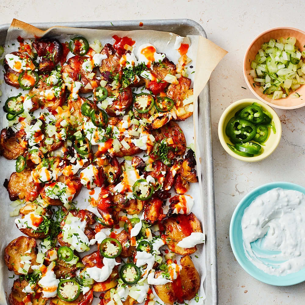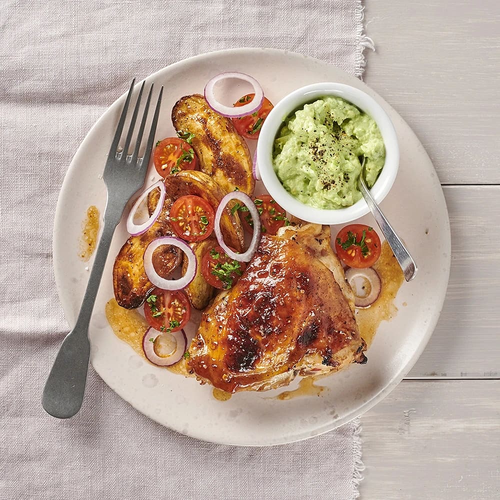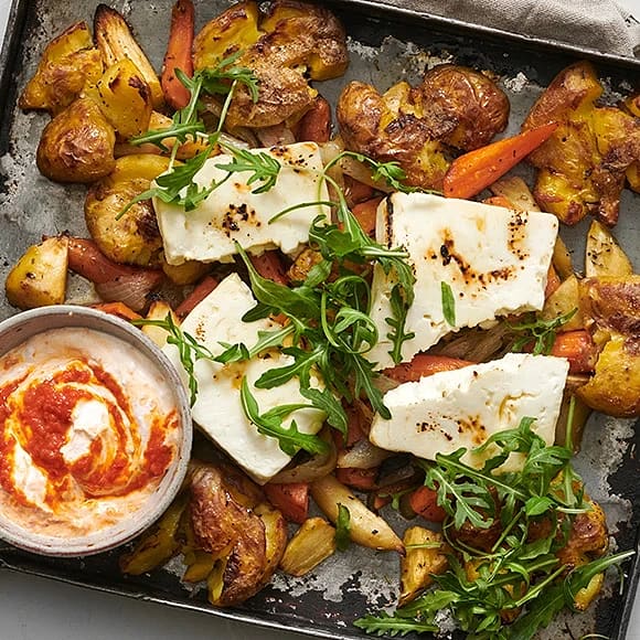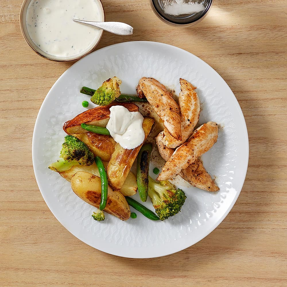 Kyckling- och grönsakspanna med rostad potatis och citronyoghurt