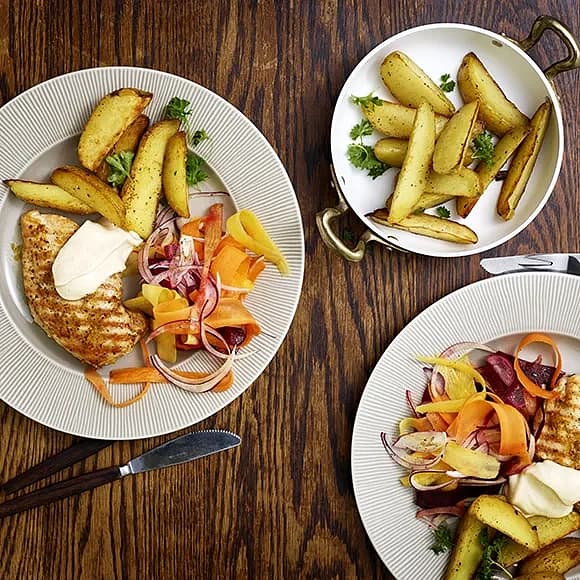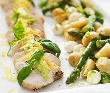 Citron- och vitlöksmarinerad kycklingfilé med potatis- och sparrissallad