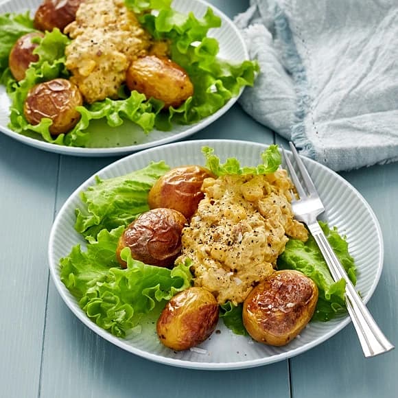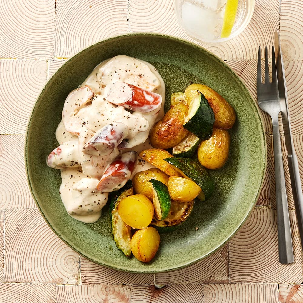Kyckling i dragonsås med kabanoss och rostad potatis