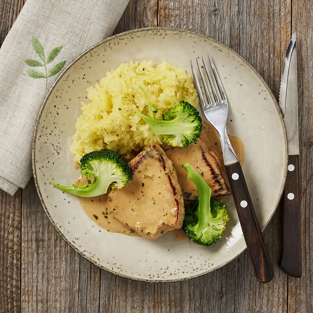 Timjanstekt fläskkotlett med rostad potatis och gräddig svampsås