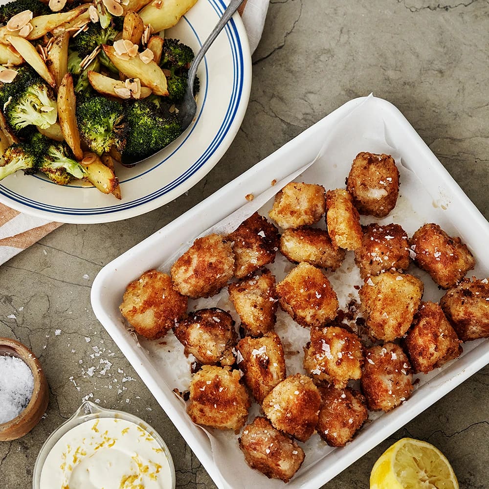 Fisknuggets med rostad potatis, broccoli och citronsås