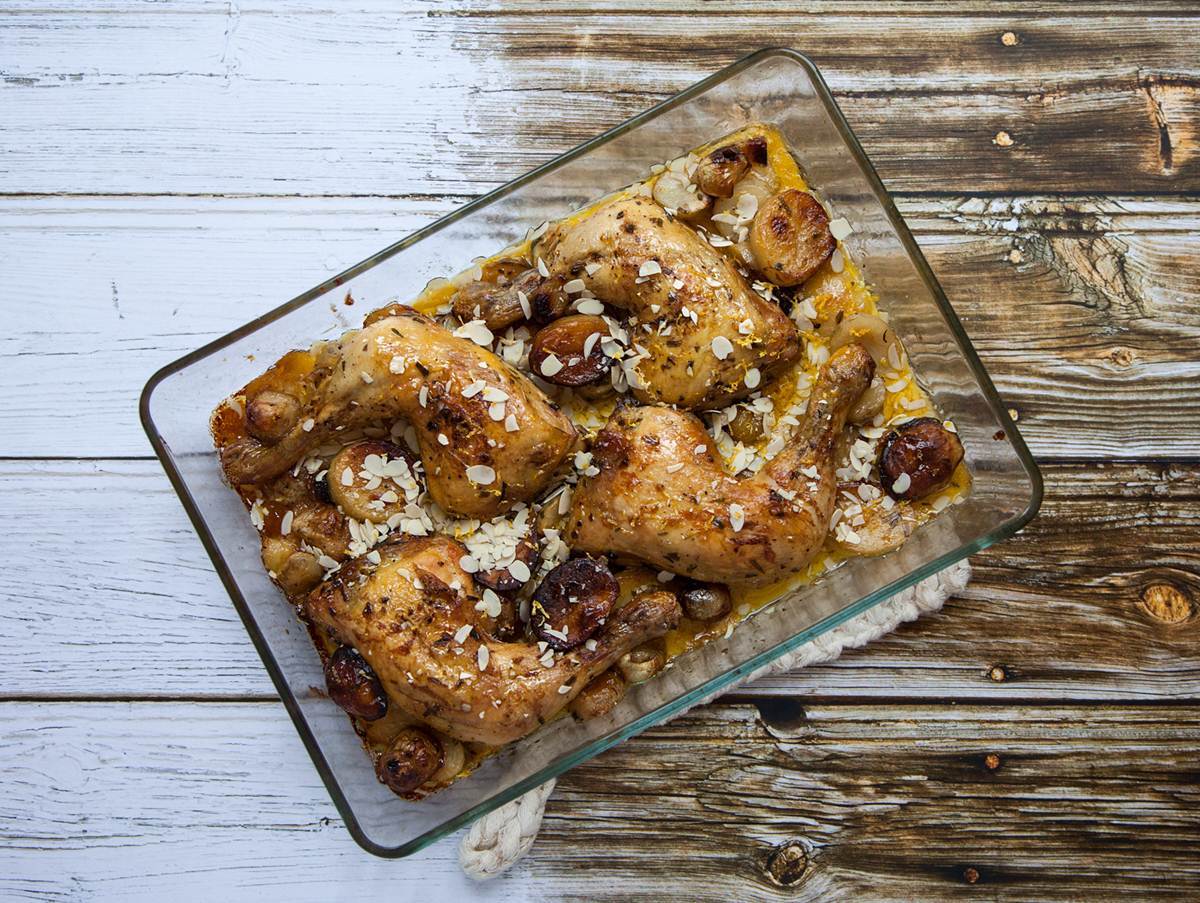 Kycklingklubbor med krämiga jordärtskockor, potatis och mandel i ugn