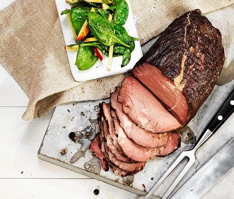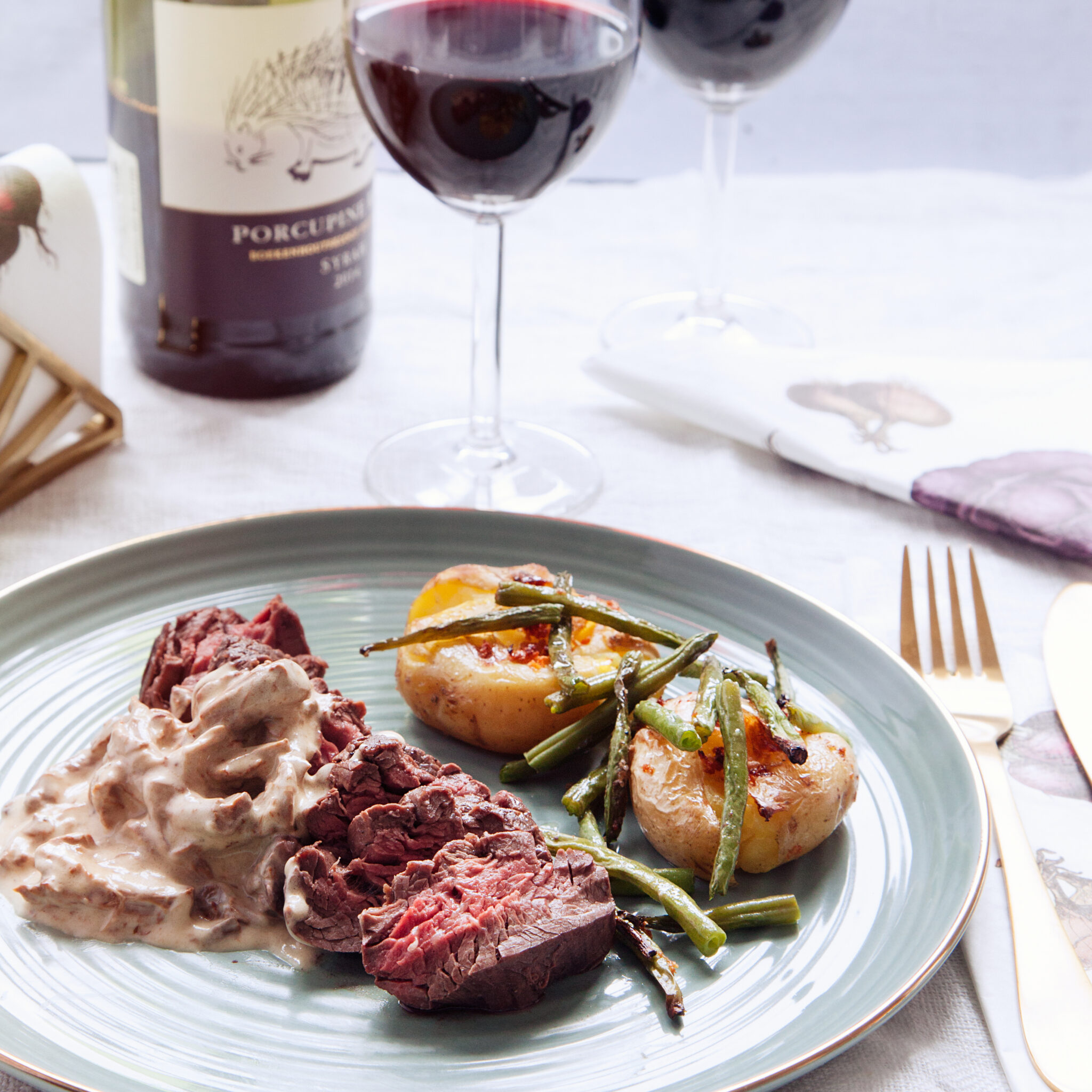 Ryggbiff med ugnsbakad potatis och grönpepparsås