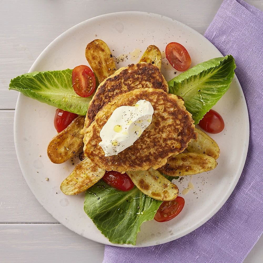 Blomkålsbiffar med rostad potatis och vitlöksdipp