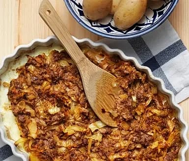 Ugnspannkaka med tacoköttfärs och riven potatis