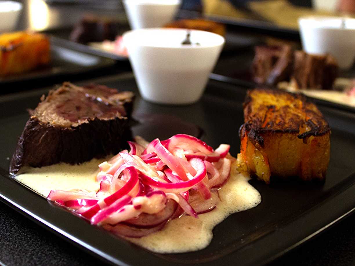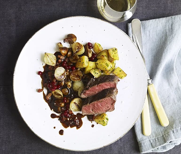Hjortinnerfilé med konfiterad potatis och rödvinssås