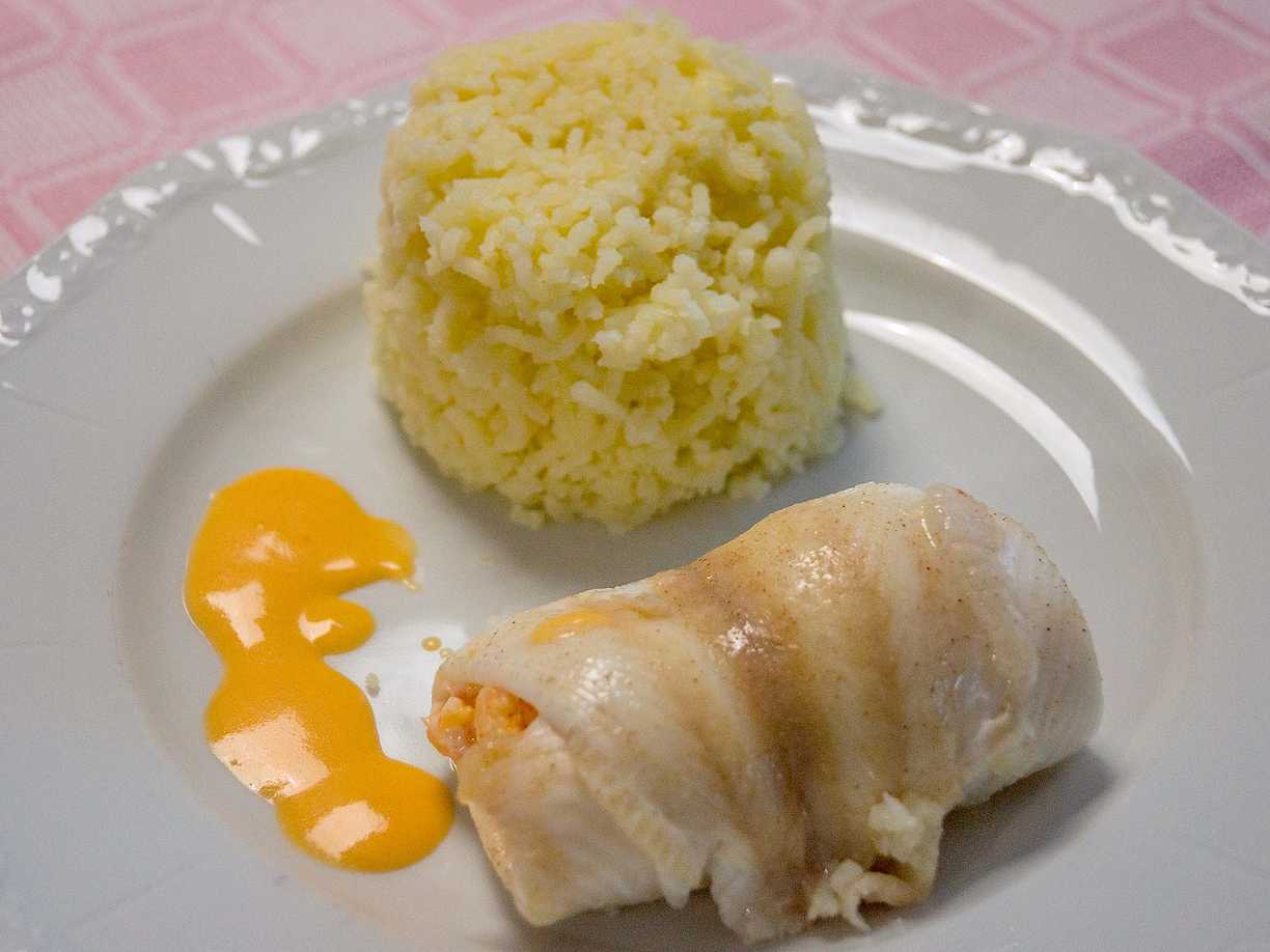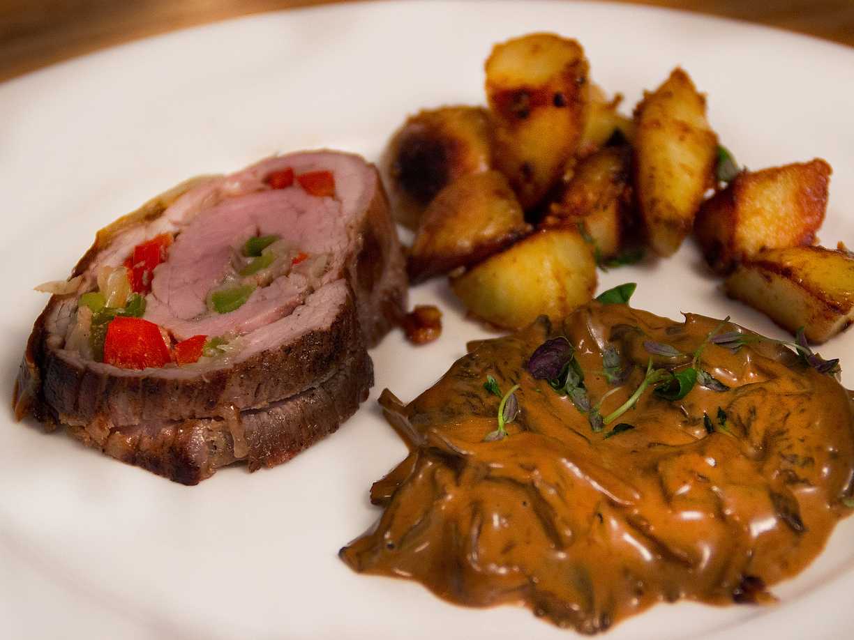 Fylld flanksteksrulle med provolone och honungsstekt potatis