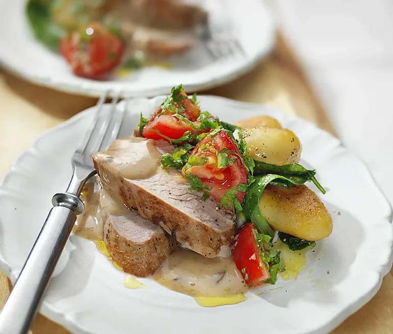 Fläskfilé med svampsås och rostad potatis