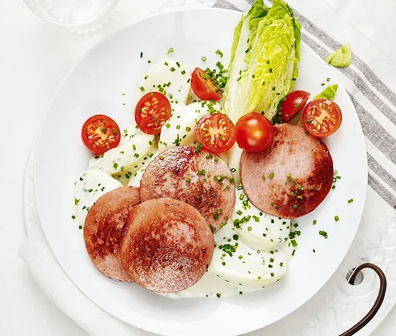 Stekt falukorv med gräslöksstuvad potatis