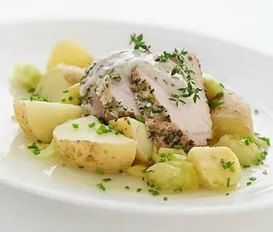 Örtbakat kalkonbröst med potatis och brysselkål