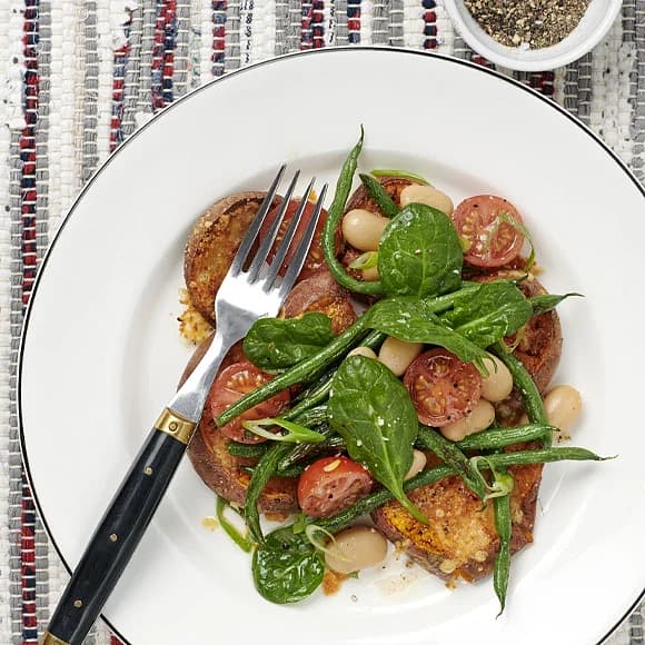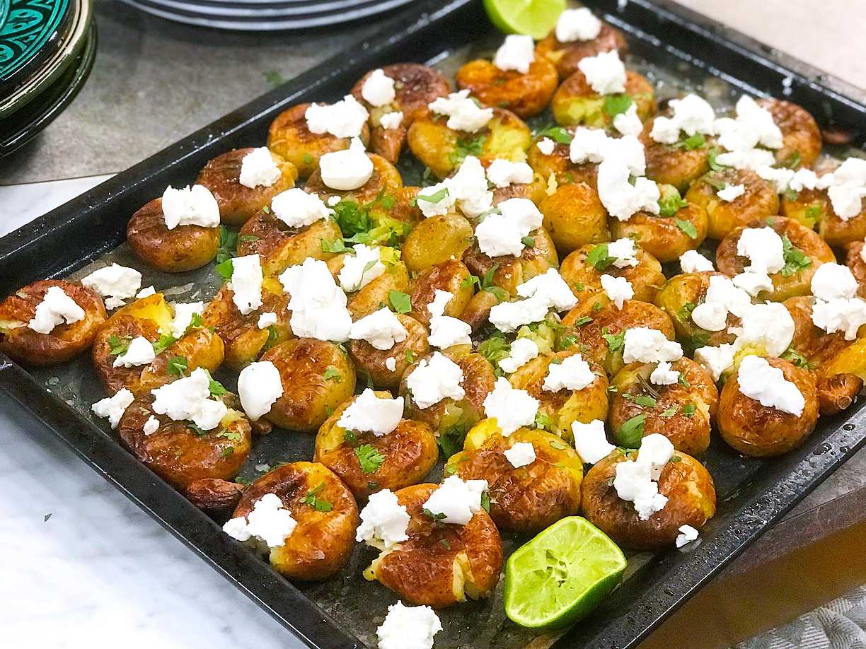Smashed sweet potatoes med syrlig bönsallad
