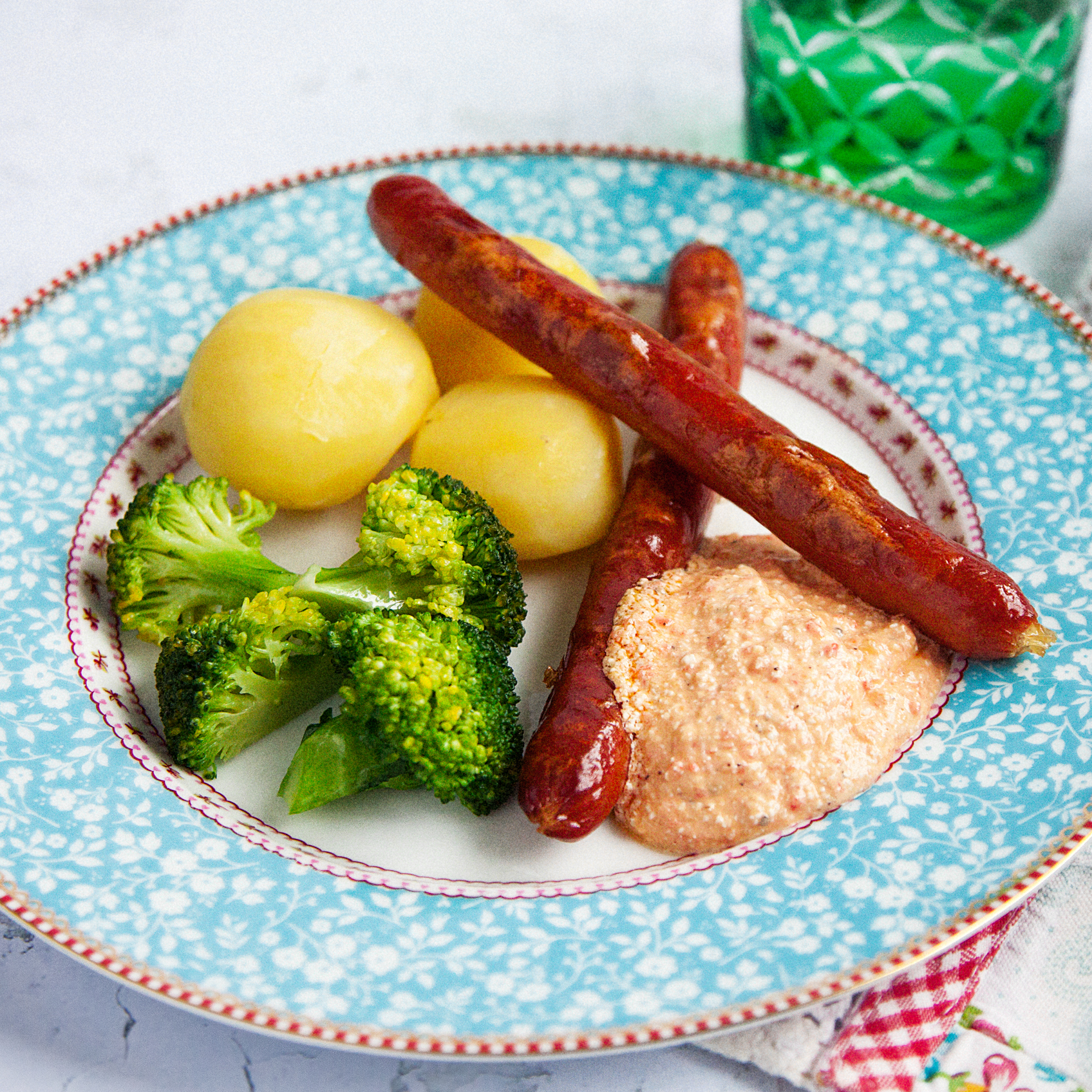 Kycklingkorv med paprikasås och kokt potatis