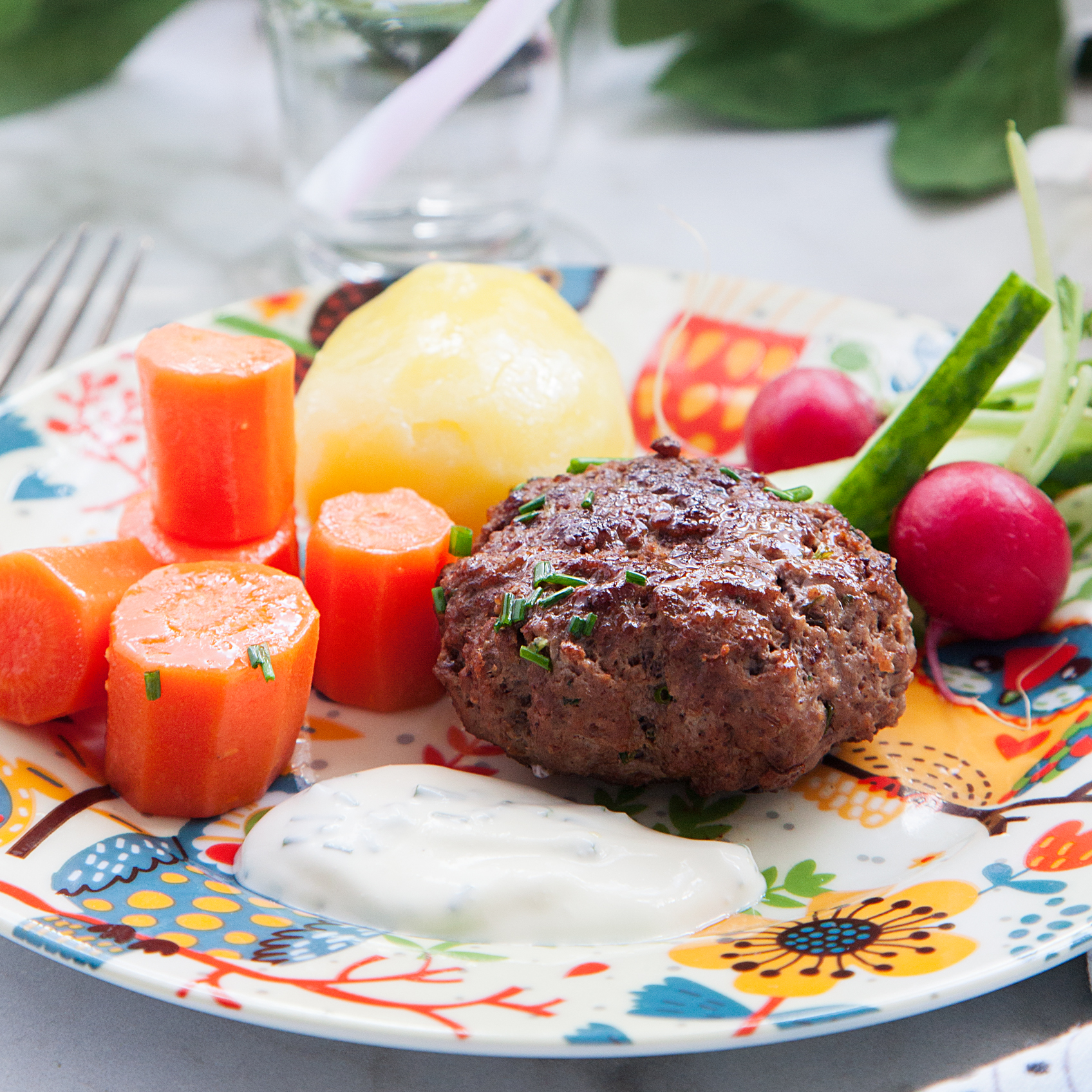 Köttfärsbiffar med kokt potatis och gräslöksdressing