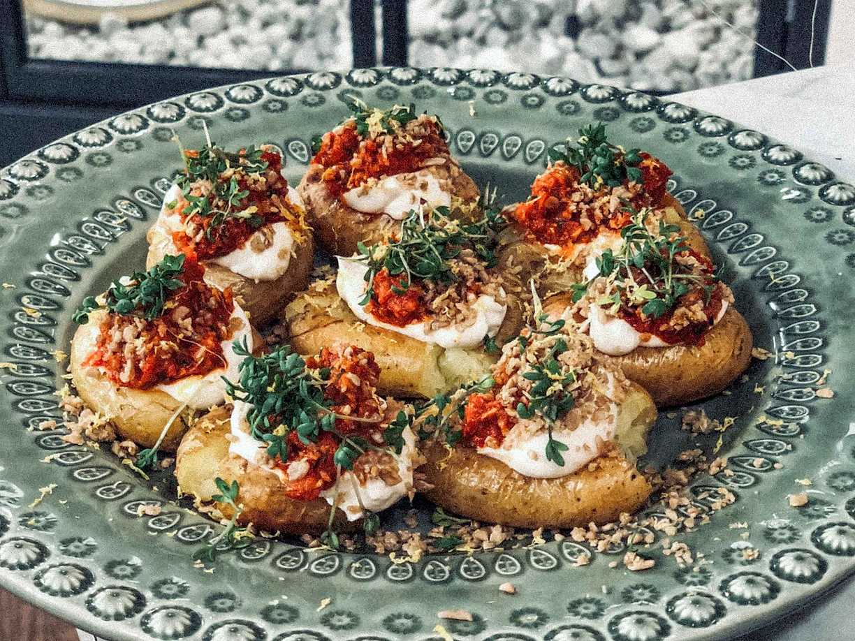 Krossad potatis med yoghurt, rökt paprikaröra och frösmul