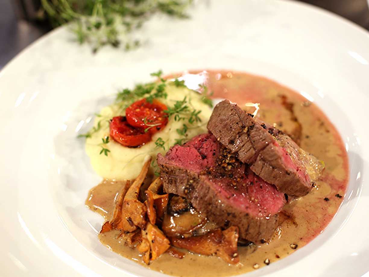 Oxfilé med skogssvampsås och potatis- och jordärtskockspuré
