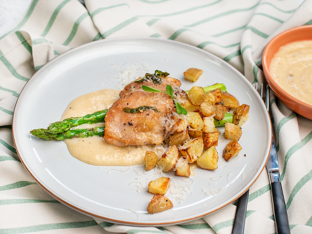 Salviastekt kycklinglårfilé med sparris och råstekt potatis