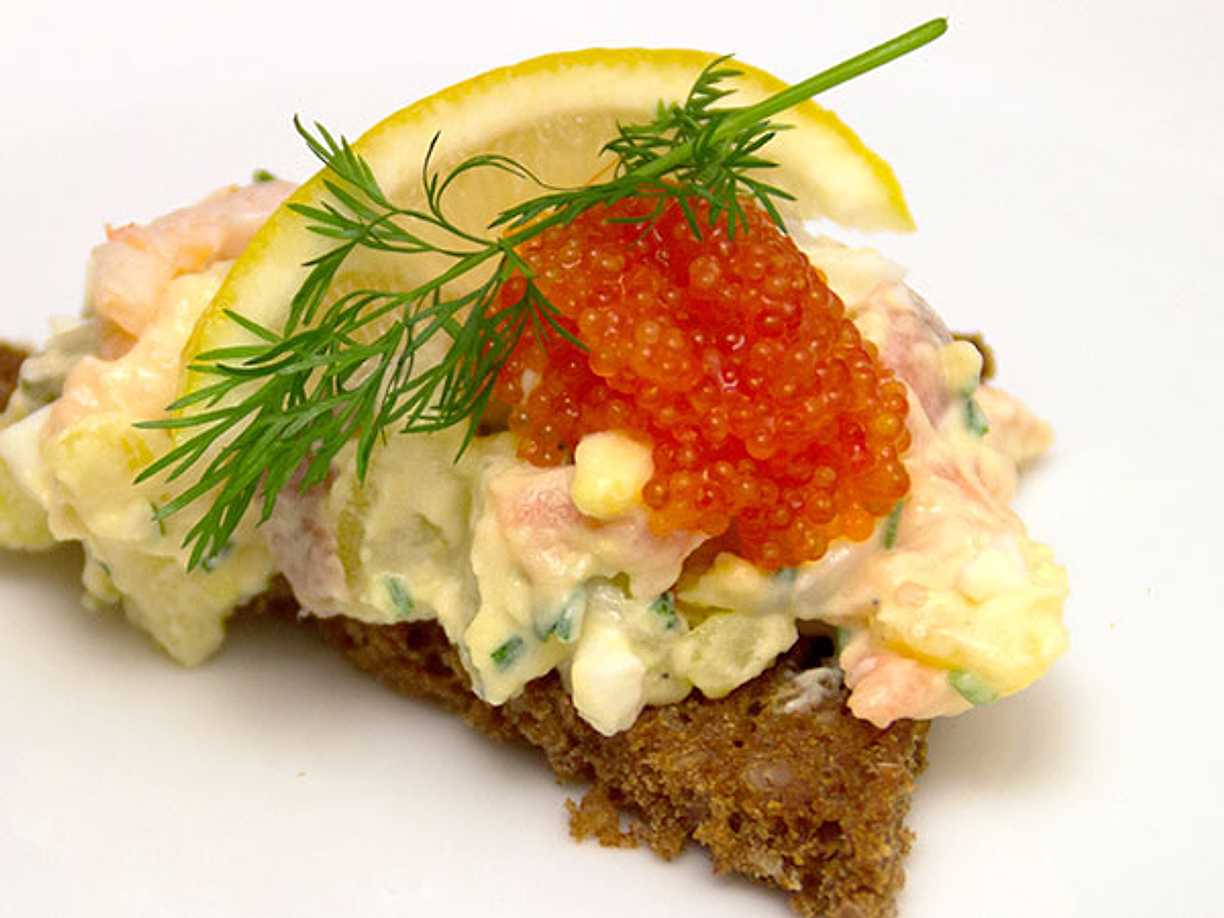 Laxröra med potatis och ägg på pumpernickel