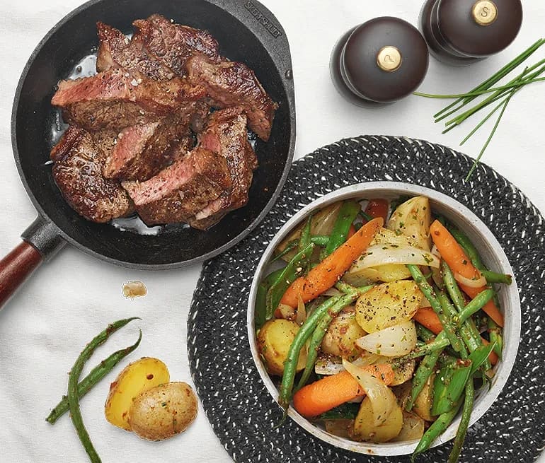 Ryggbiff med potatis- och jordärtskocksgratäng och svampsky