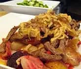 Potatis och rödbetor i låda med strimlat oxkött och sötsur sås