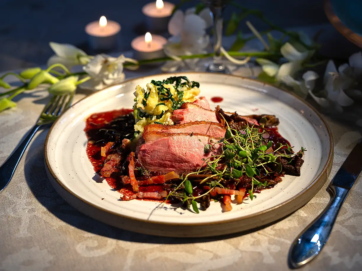 Ankbröst med potatis- och getoststomp samt portvinssås