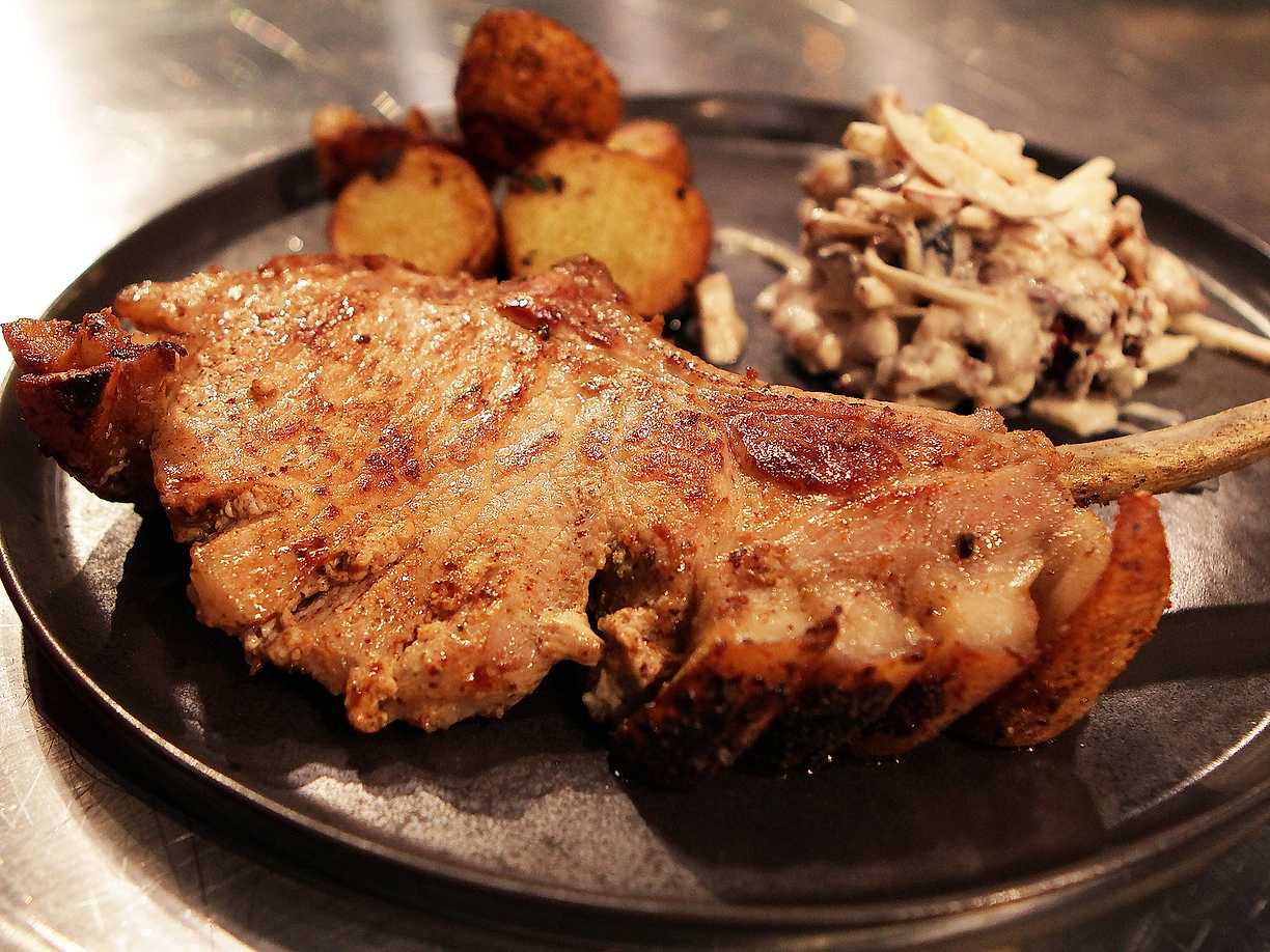 Stekt fläskkotlett, råstekt potatis och parmesankräm