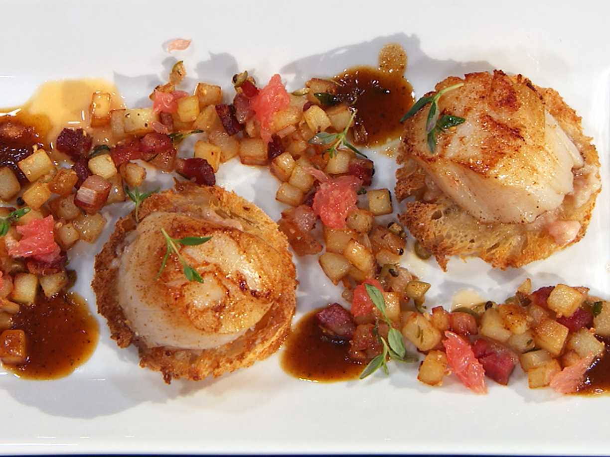 Pilgrimsmusslor på toast med potatis- och pancettapytt