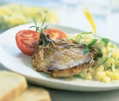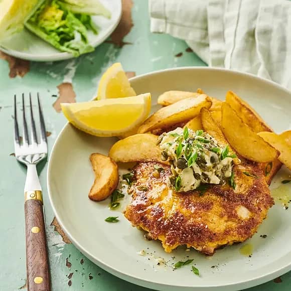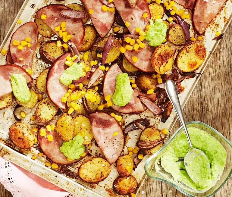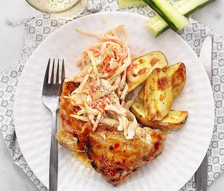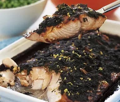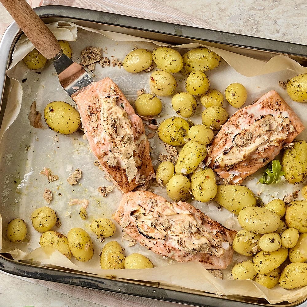 Stekt lax med kryddig örtsås samt citron- och honungsslungad potatis