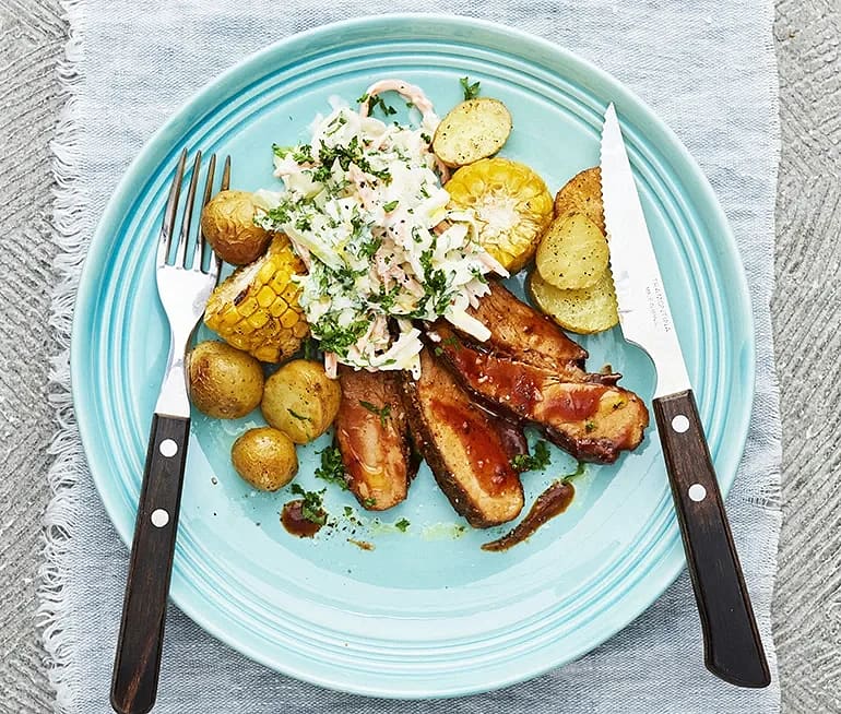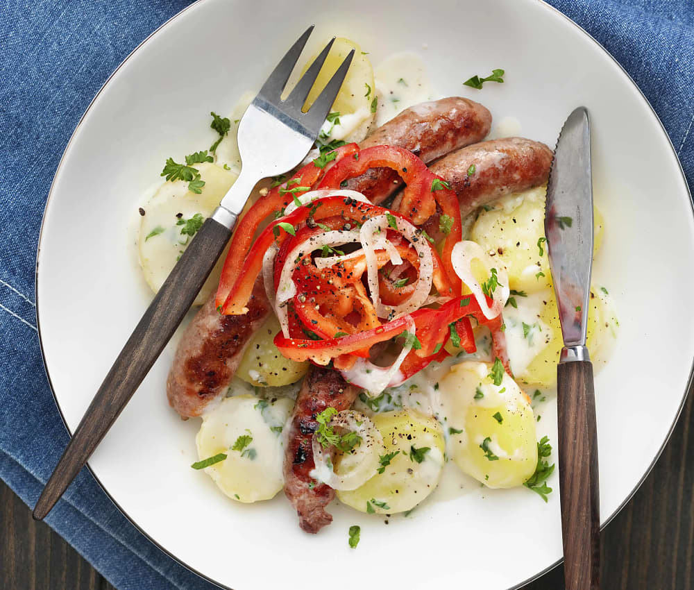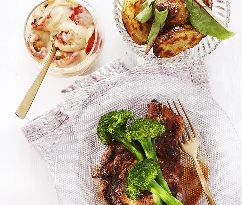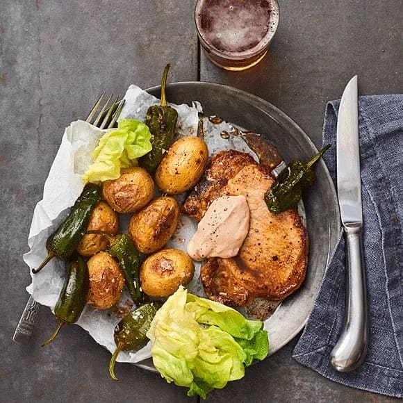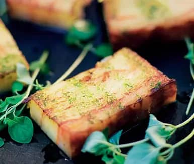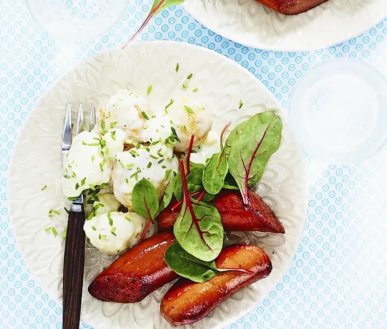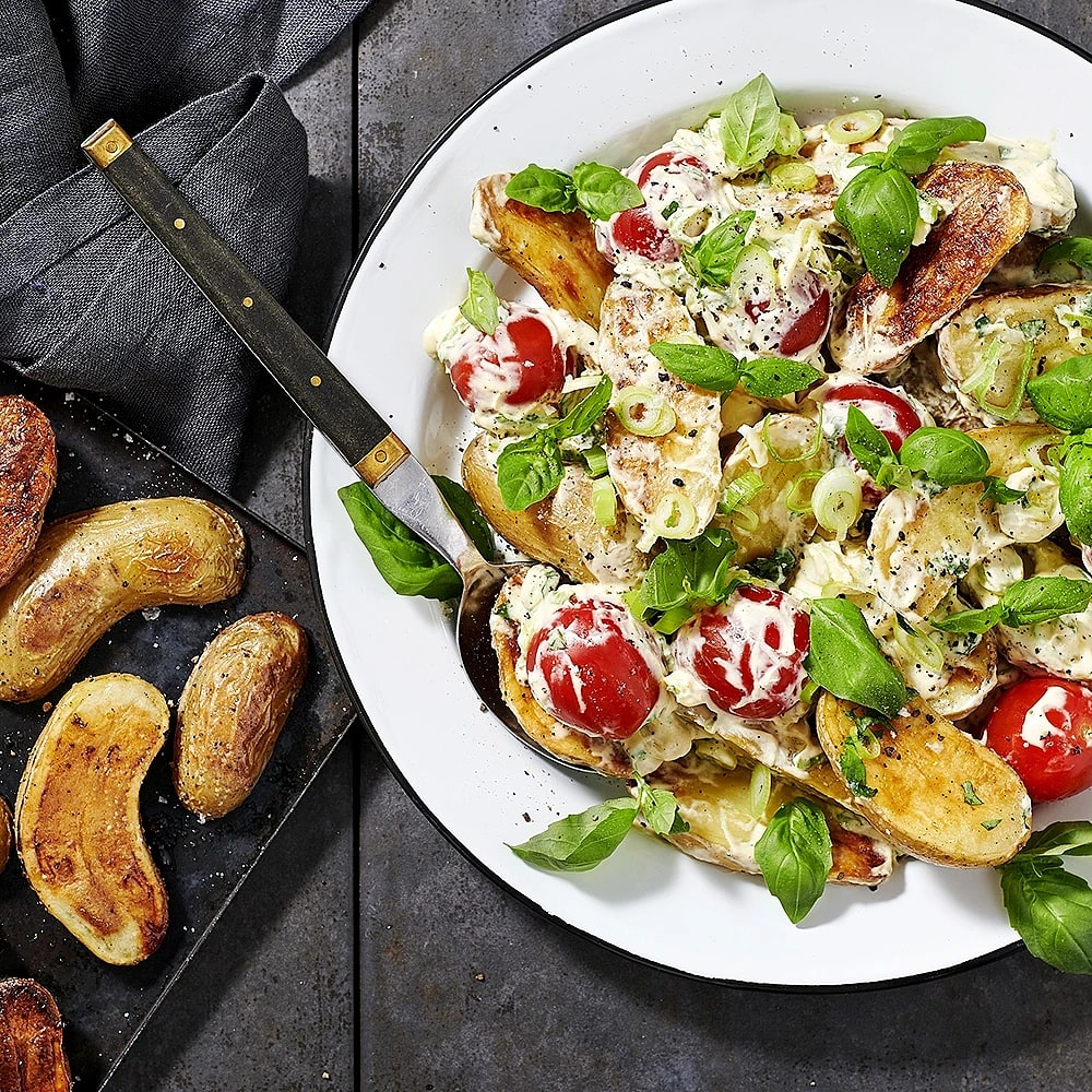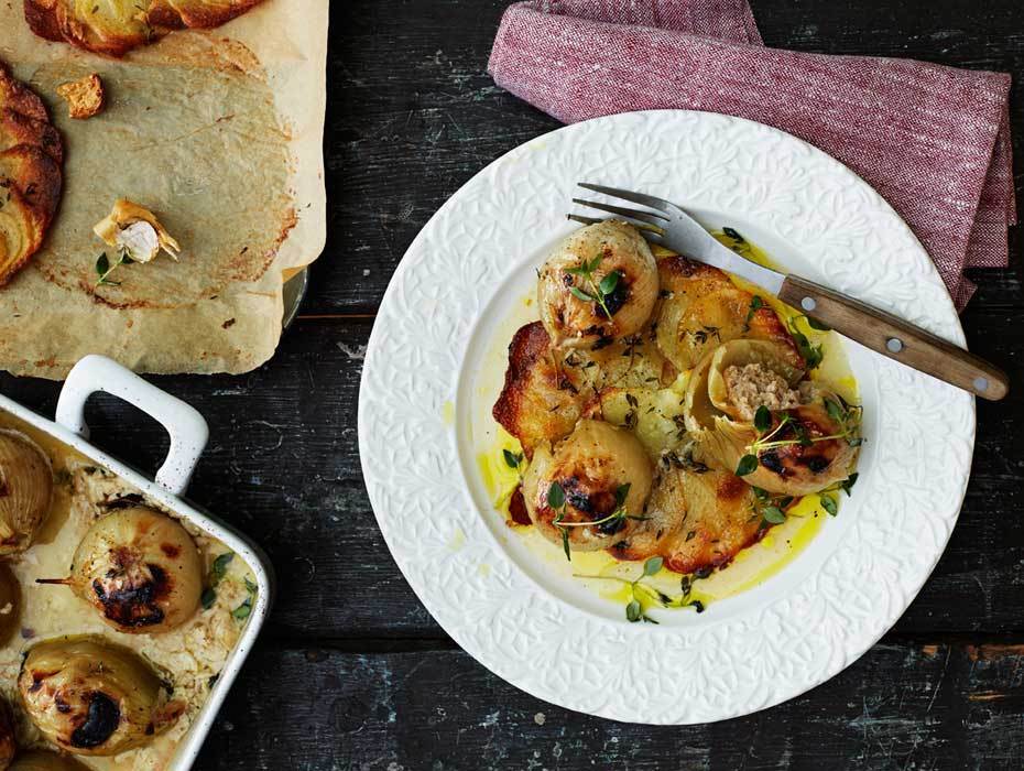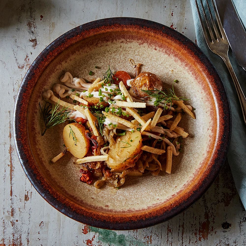 Rostade och rökta potatisar med ölkaramelliserad lök