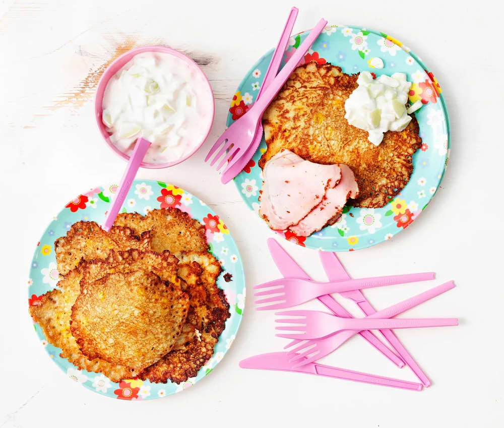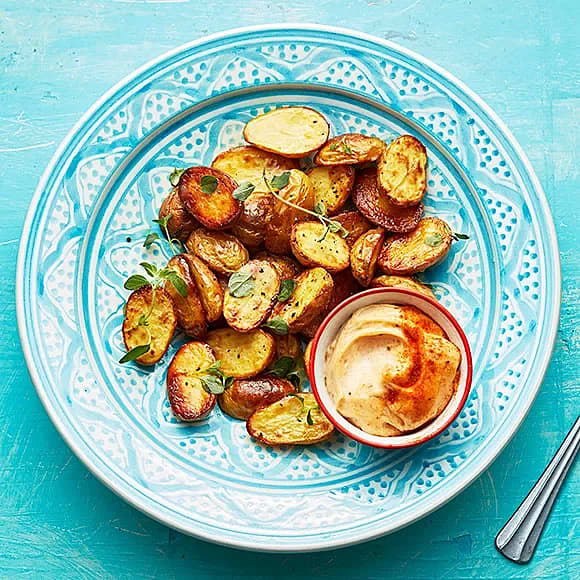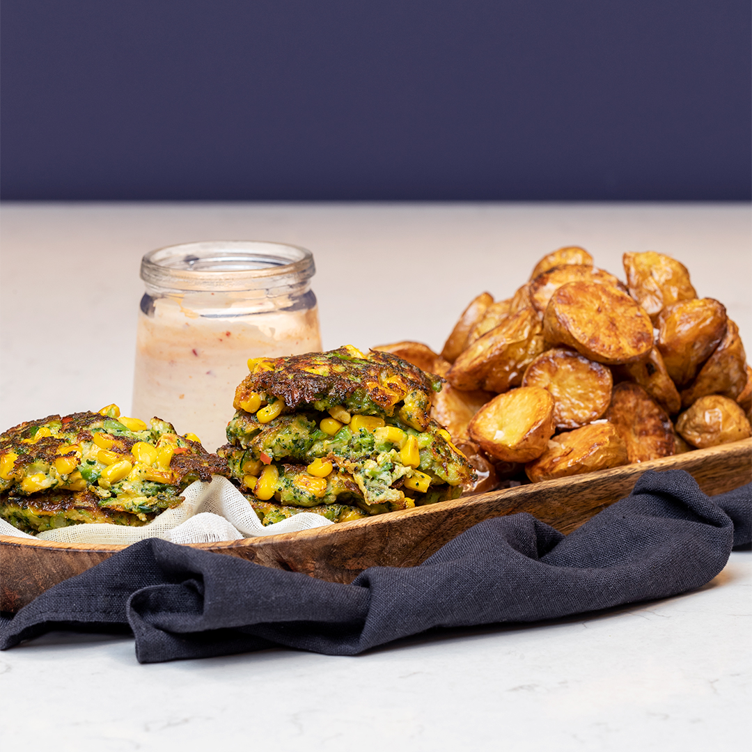 Broccoli- och majsfritters med rostad potatis och chilimajo