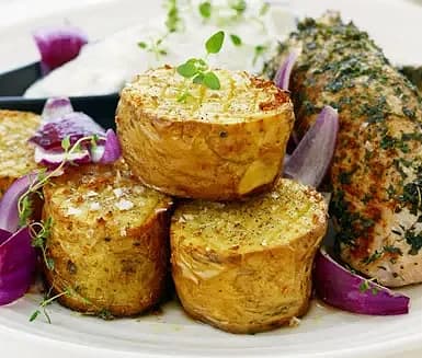 Grekisk kalkon med feta- och vitlöksbakad potatis