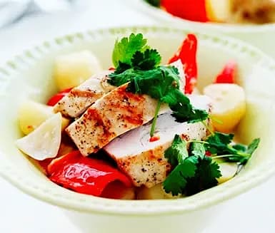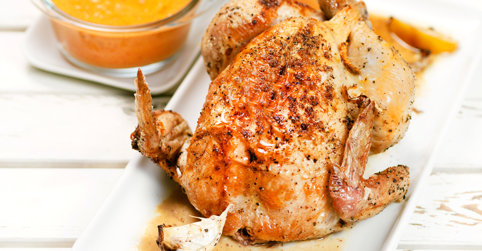 Helstekt kyckling med mojo rojo och saltbakad potatis
