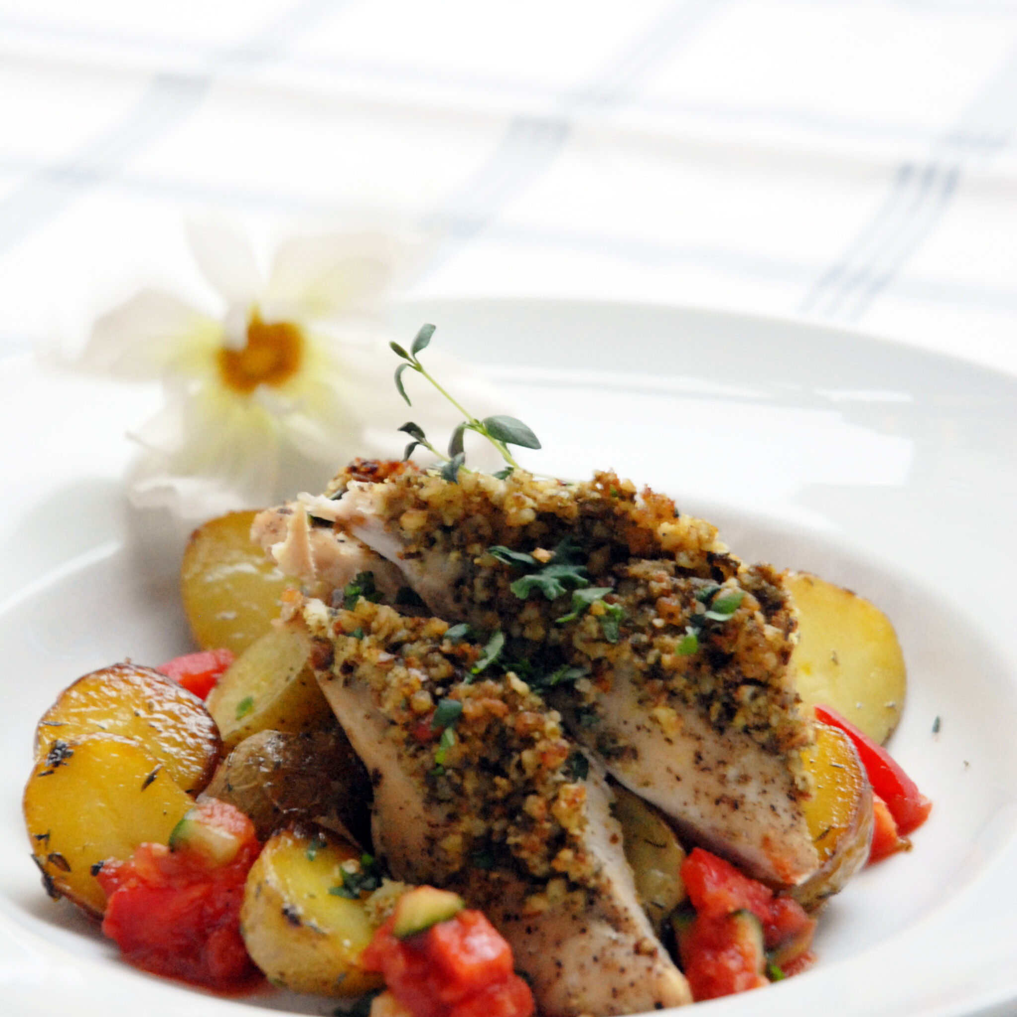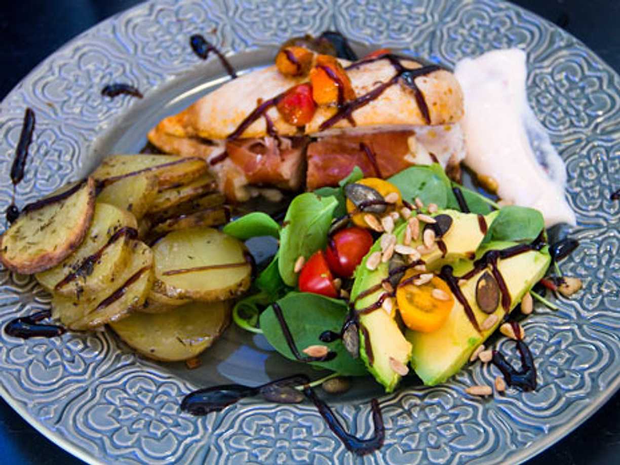 Mozzarella- och serranofyllda kycklingfiléer med potatis och het sås