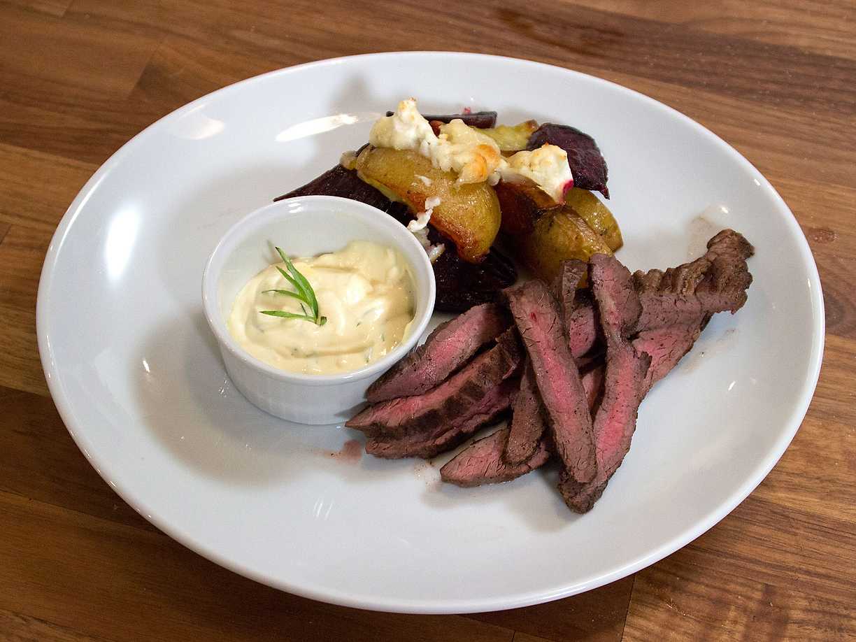 Flankstek med potatis och rödbetor, serveras med dragonkräm