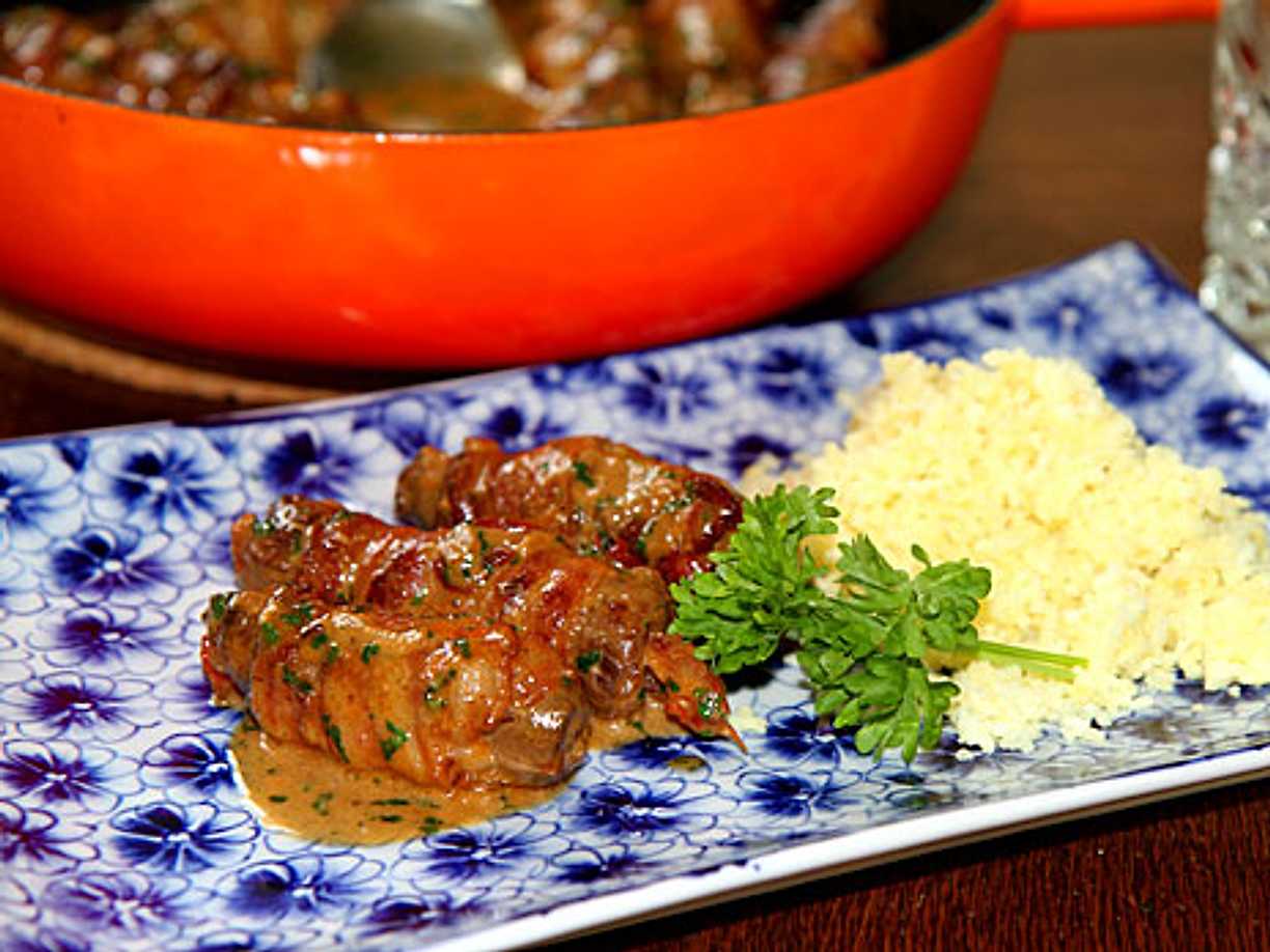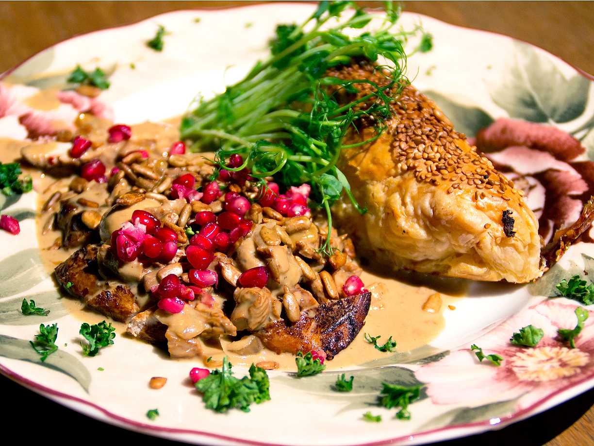 Marinerad kycklingfilé med svampsås och smördegsinbakad potatis