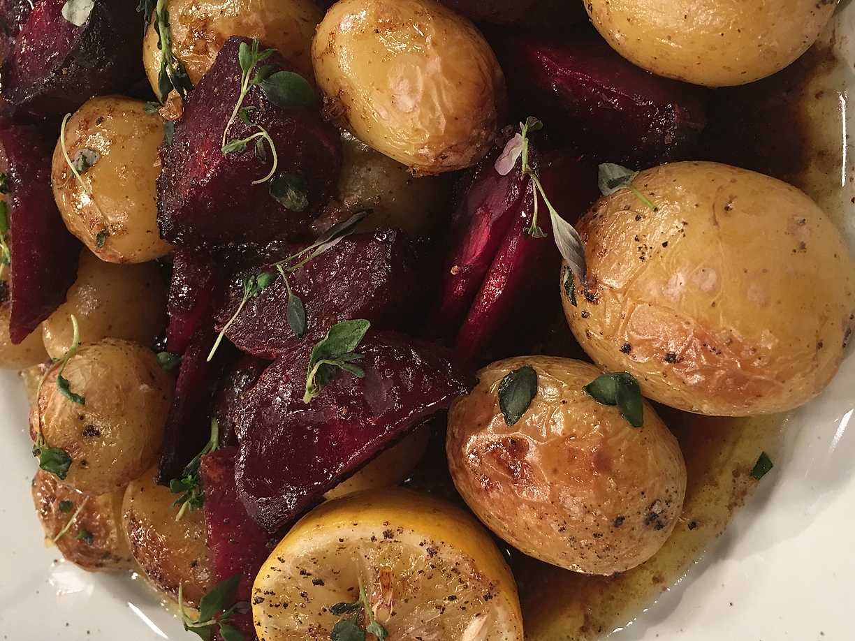 Smörbakade rödbetor och potatis med honung, lakrits och timjan