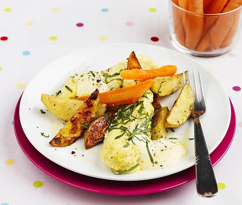 Chicken nuggets med currydip och klyftisar