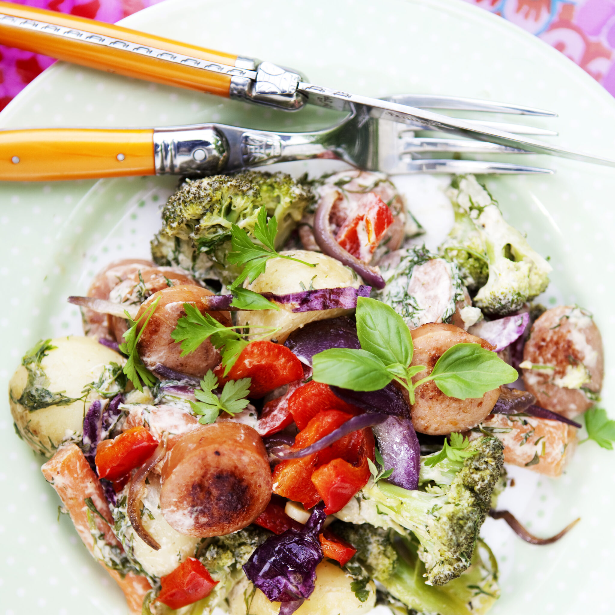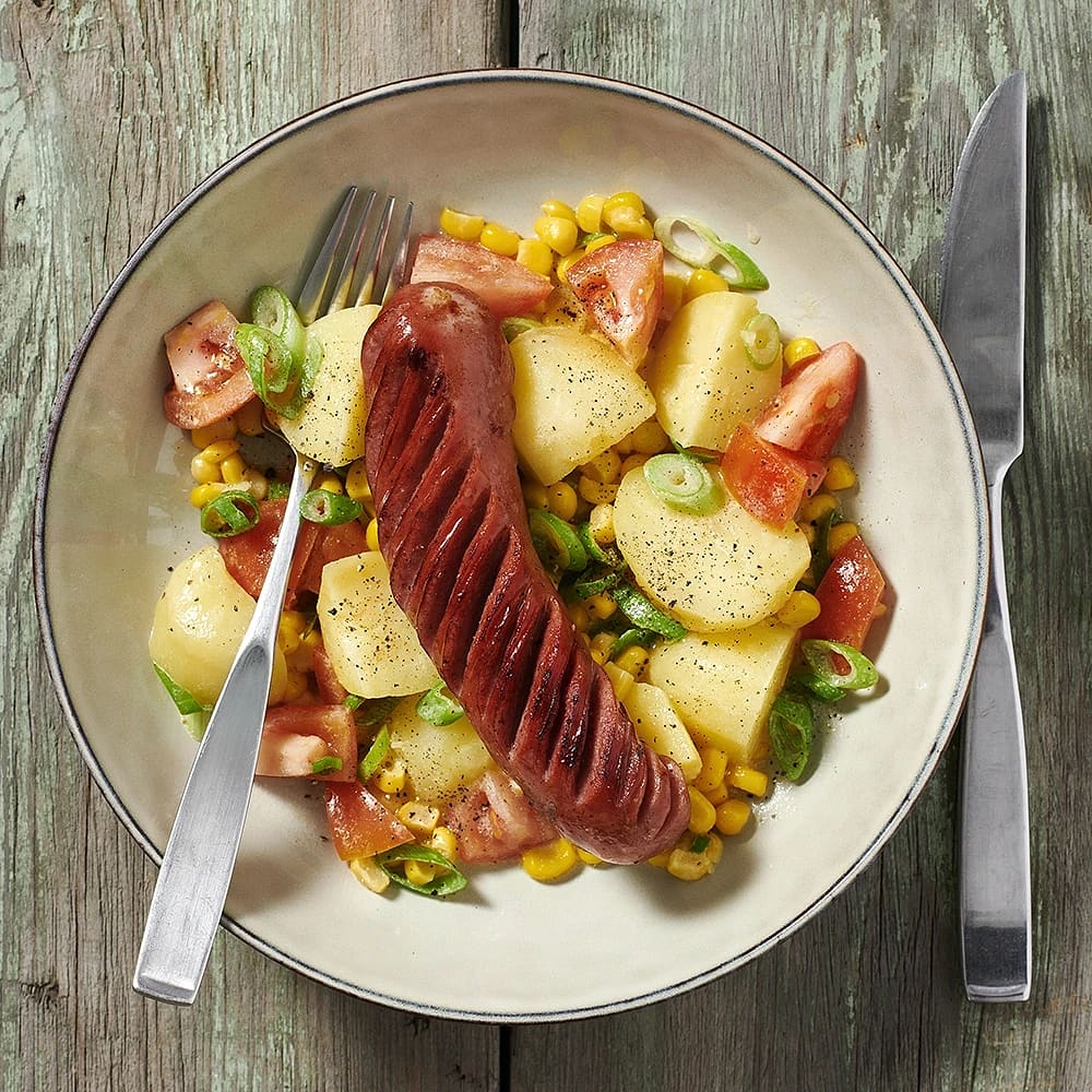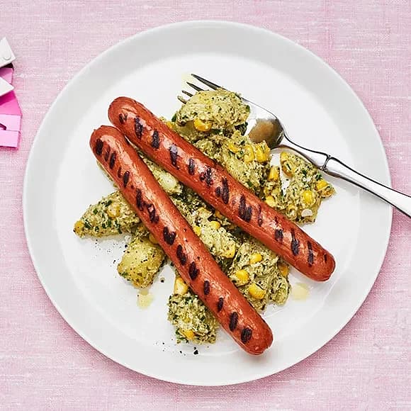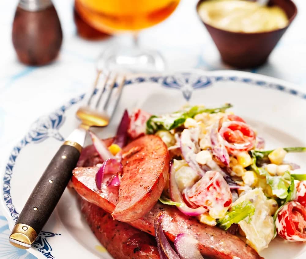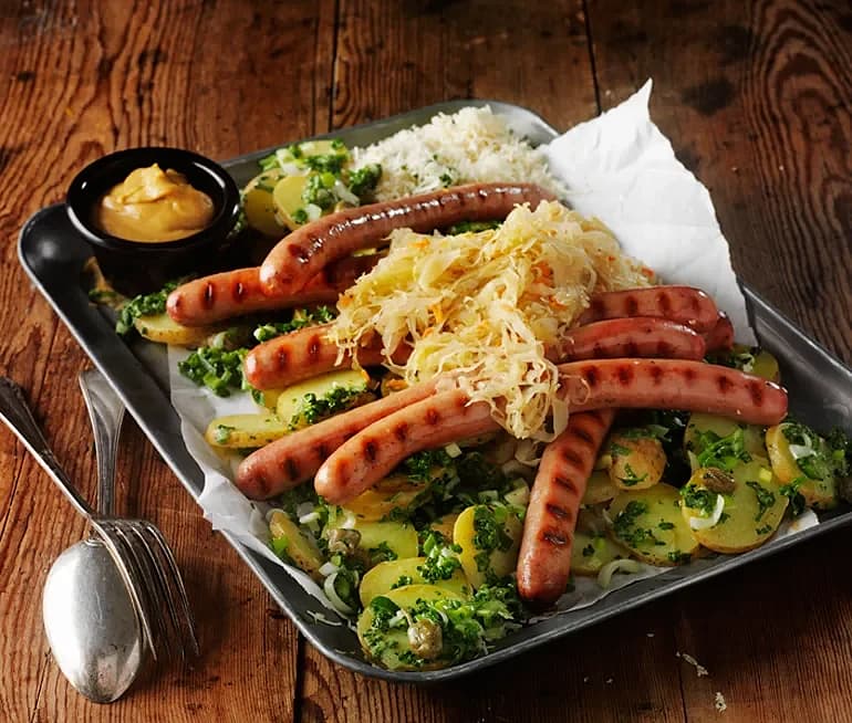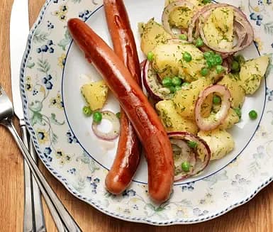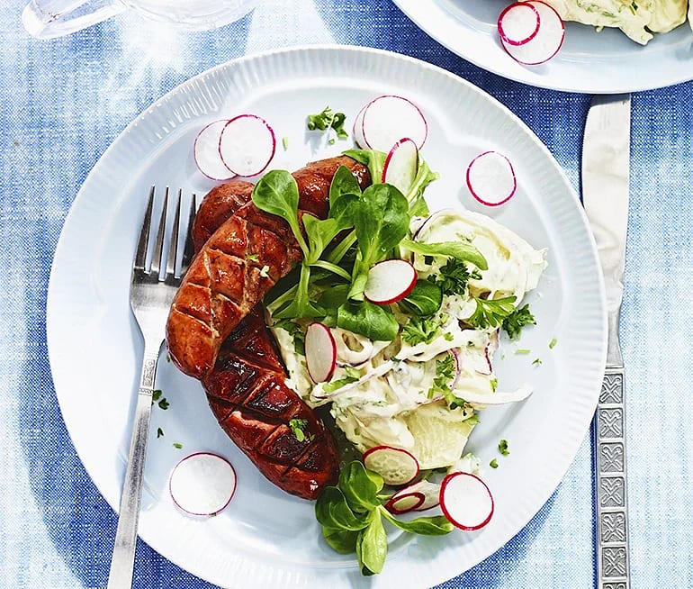 Råkorv med tysk potatissallad och smakrik vitlökskål
