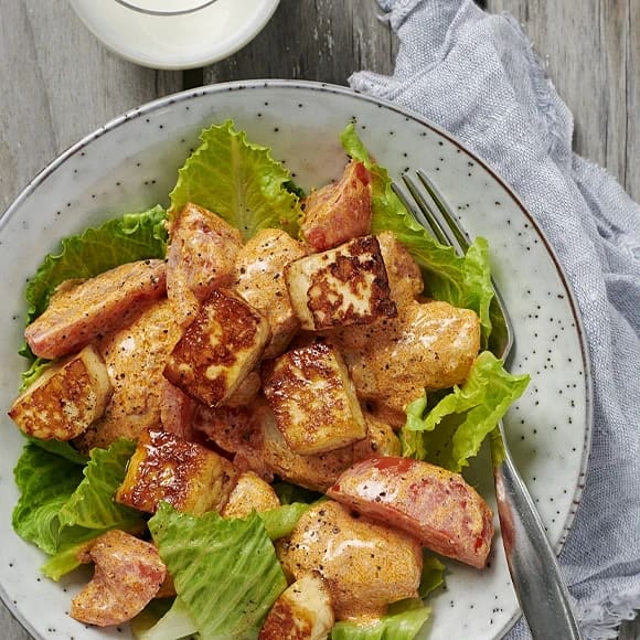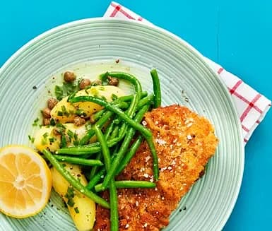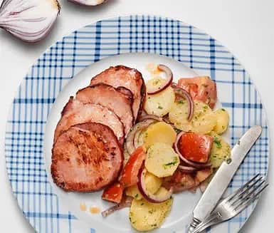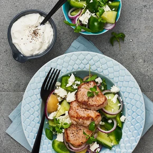 Örtstekt skinkschnitzel med grekisk potatissallad