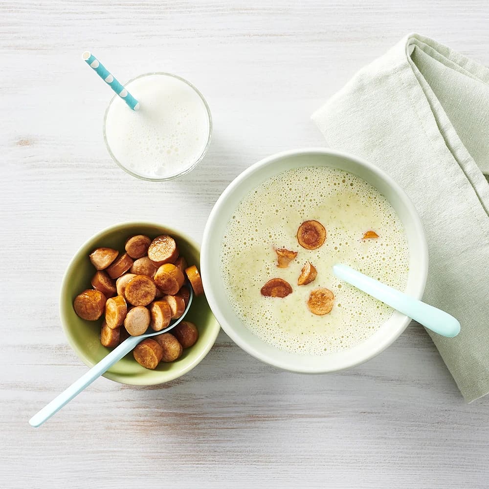 Krämig broccoli- och potatissoppa med korvslantar