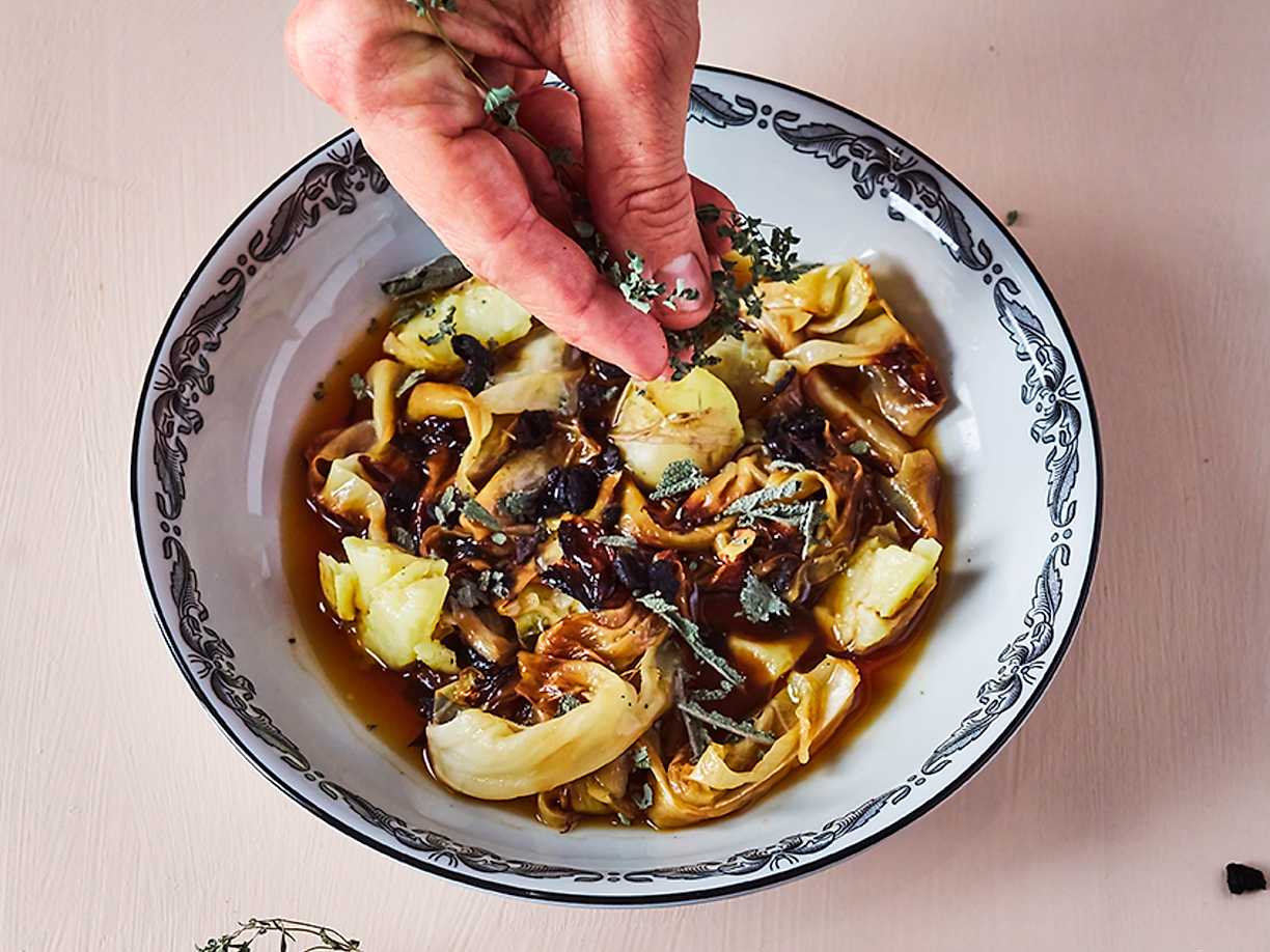 Kål-och potatissoppa, olivolja och torkade örter