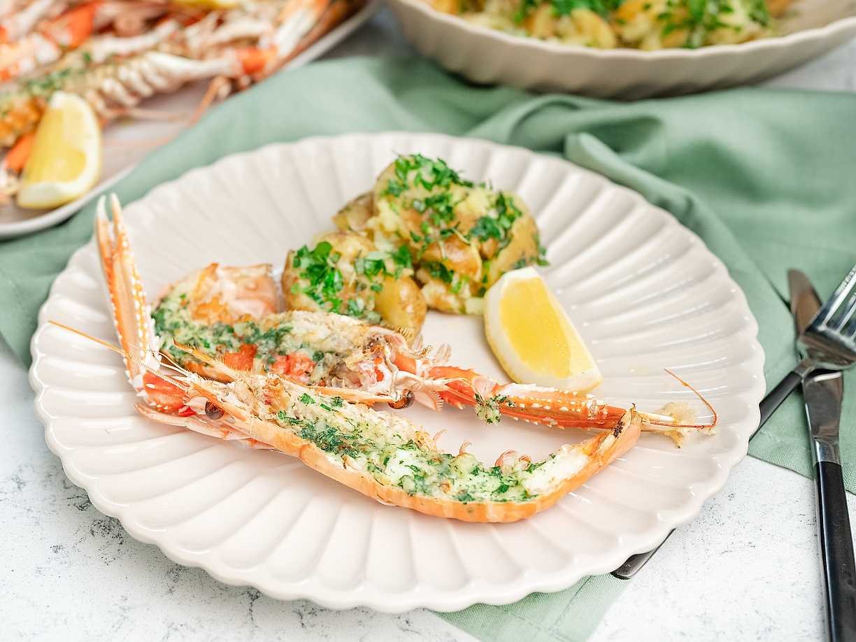 Gratinerade havskräftor med örtigt potatisstomp