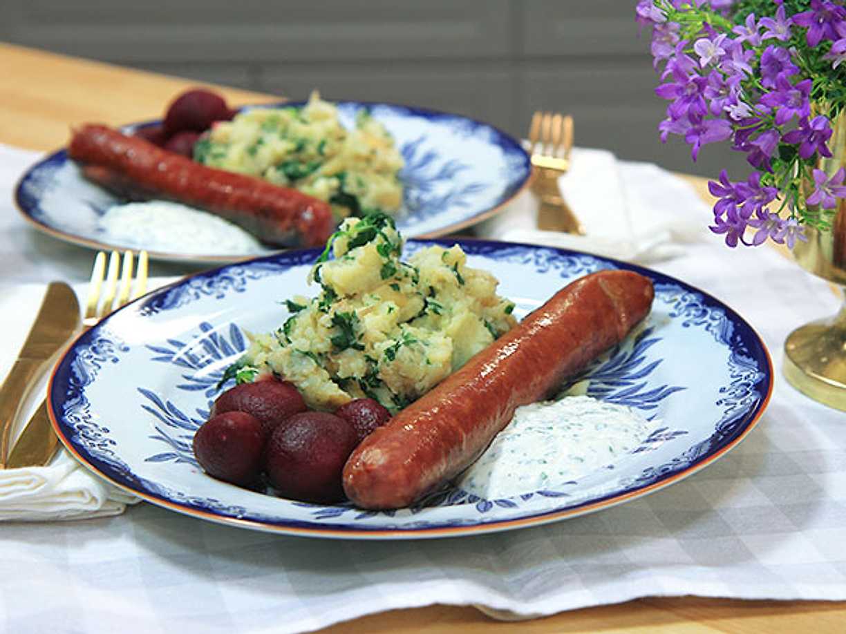 Stekt korv med gräddkokt fänkål och potatisstomp