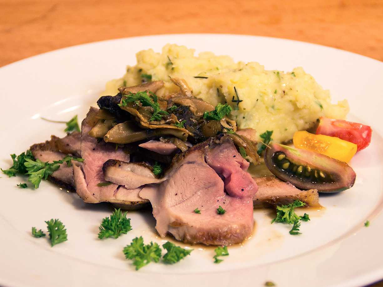 Rosastekt killingkött med potatisstomp och champinjonsky
